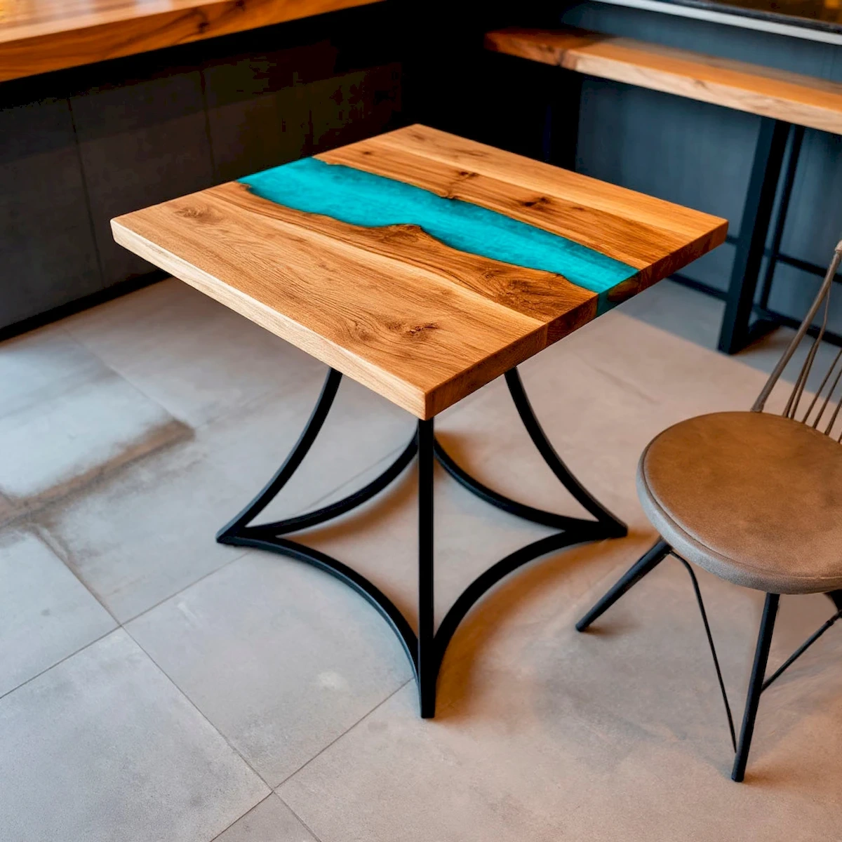 Особенность дизайна: По центру столешницы проходит эффектная «река» из эпоксидной смолы бирюзового цвета с перламутровым эффектом, вплавленная в дерево. Контраст тёплого дерева и яркой смолы создаёт завораживающий эффект природного ландшафта.