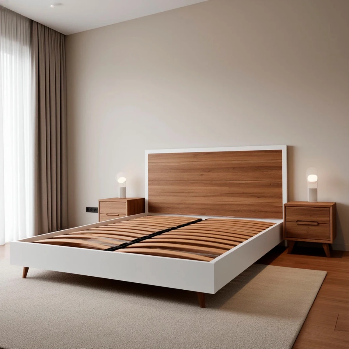 - Сочетание материалов: белый цвет каркаса (скандинавская лаконичность) и натуральное дерево изголовья (японское тепло и природность).