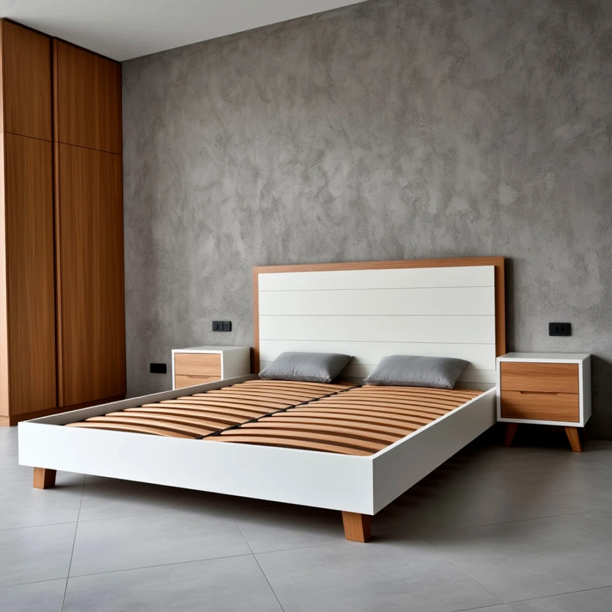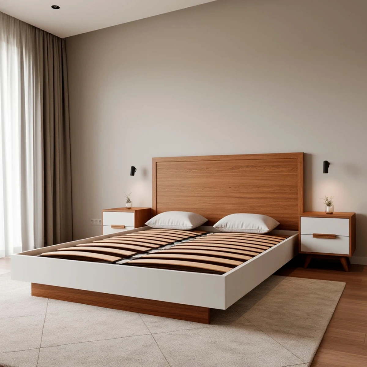 - Баланс стилей: Белый корпус отсылает к скандинавскому стилю, а деревянное изголовье — к японской сдержанности.