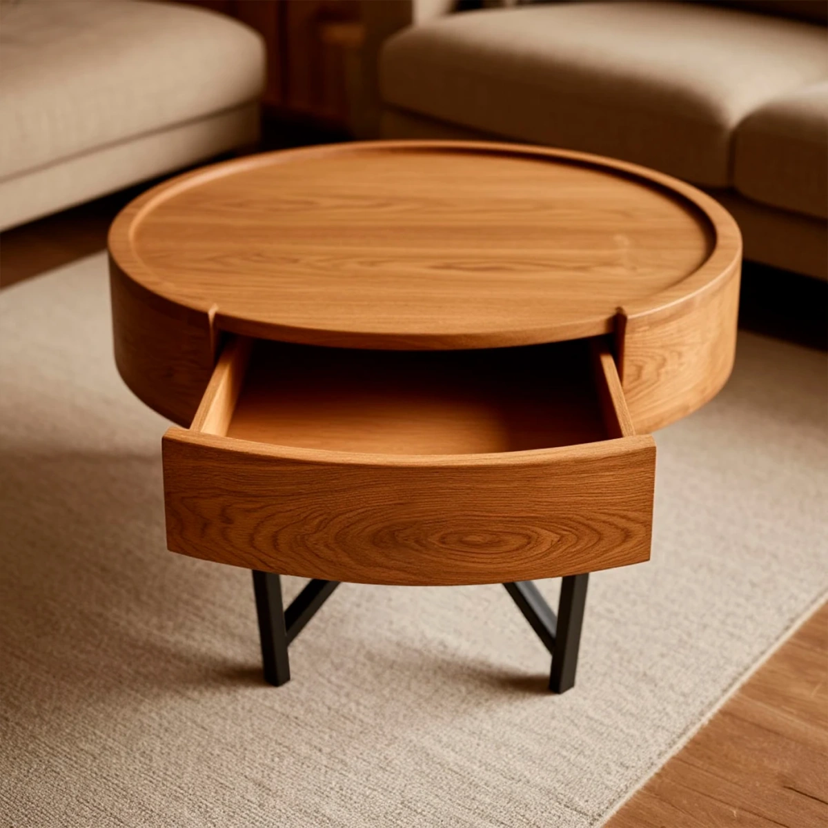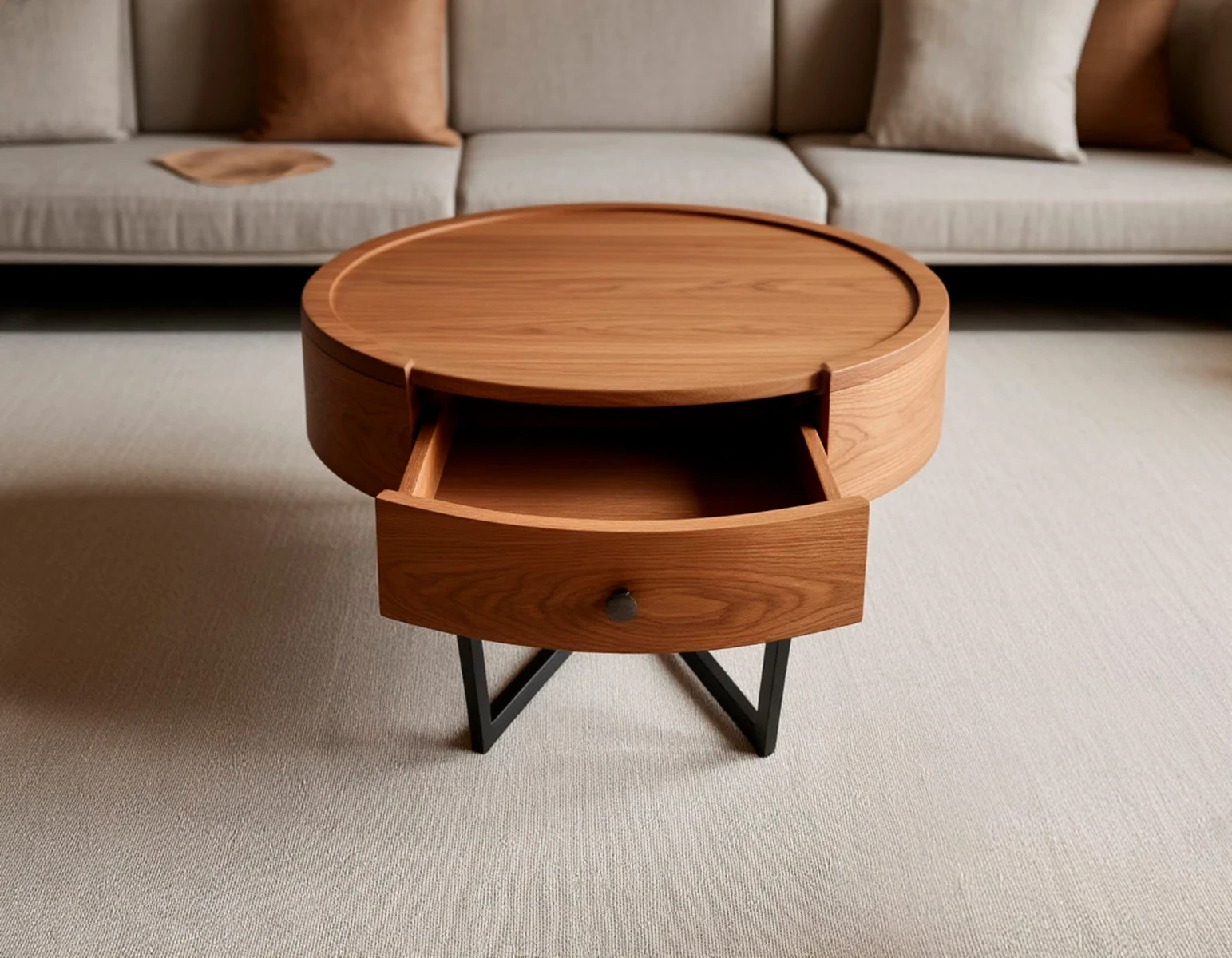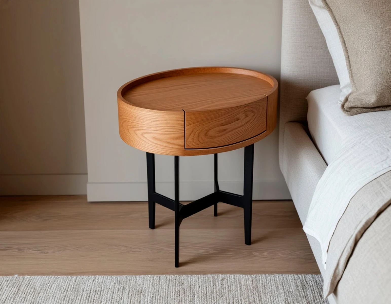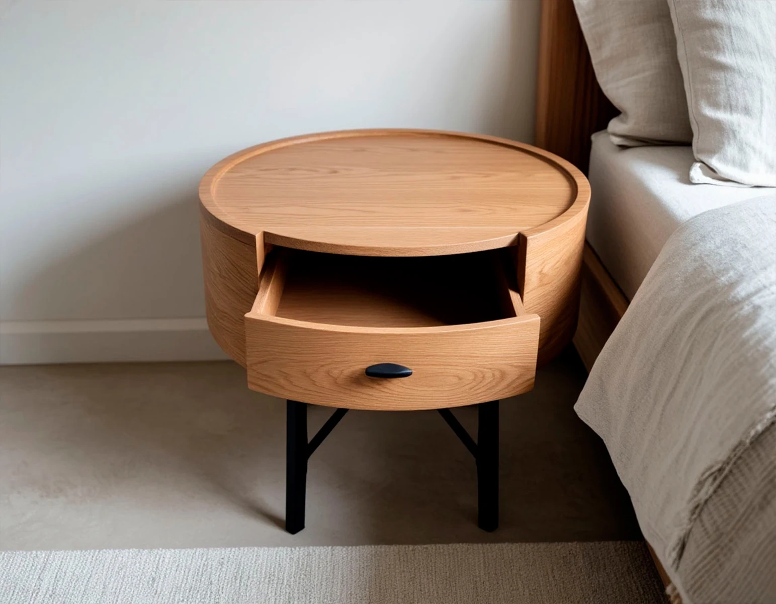 Конструктивная особенность: встроенный выдвижной ящик оборудован премиальной фурнитурой Blum с механизмом открывания Tip-On. Это практичное решение для хранения мелочей: книг, очков, пультов, косметики. Ящик выполнен в том же стиле, что и сам столик, без лишних деталей.