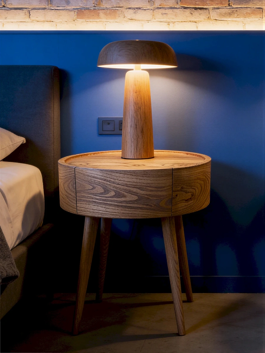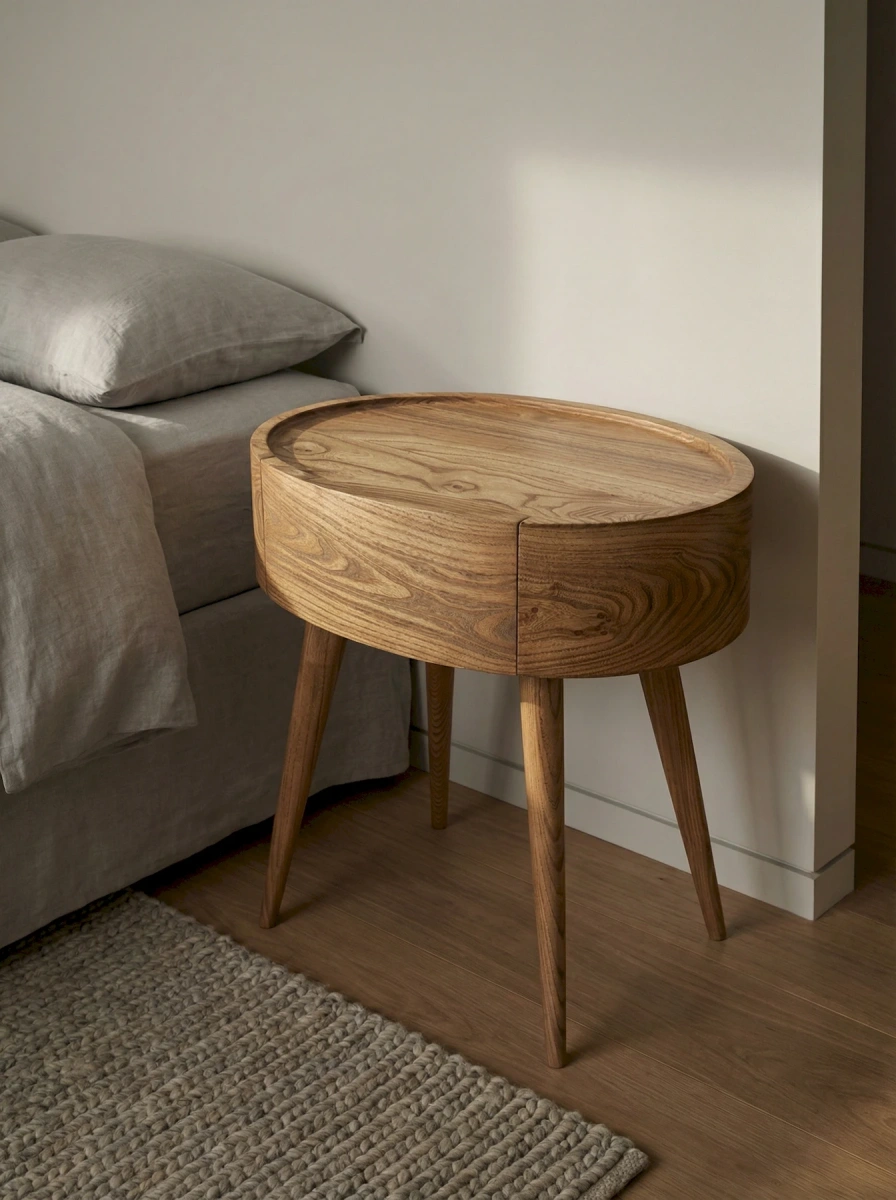 Круглая прикроватная тумба журнальный столик из массива дерева с лаконичным дизайном, плавными линиями и деревянными ножками станет акцентом в нескольких популярных стилях.
