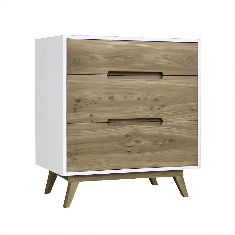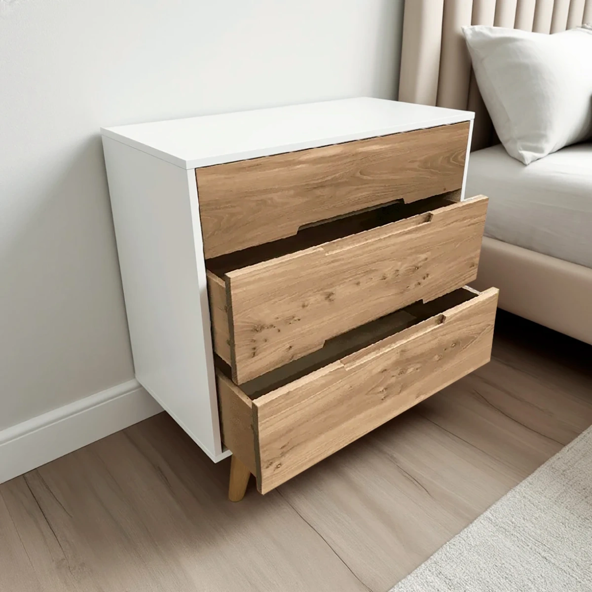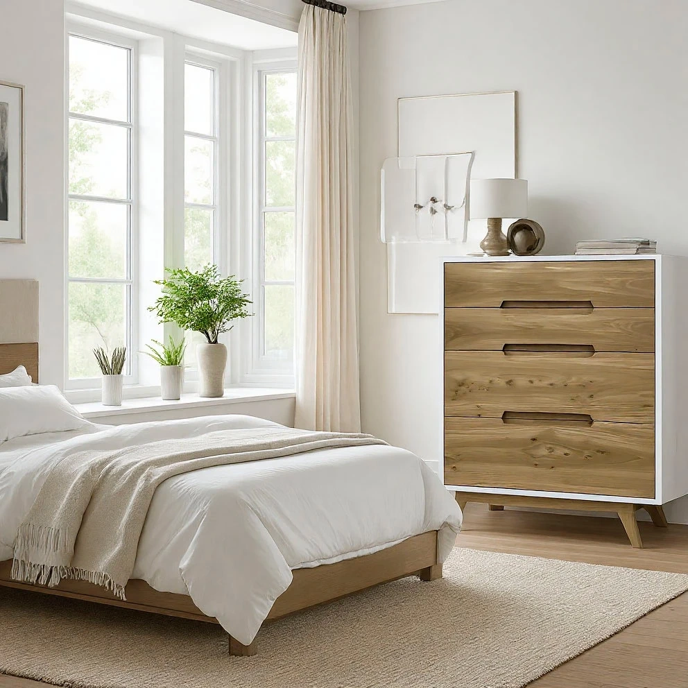 - Характерное сочетание: Белый цвет (МДФ под эмалью) и текстура натурального дерева карагача — классика скандинавского минимализма.