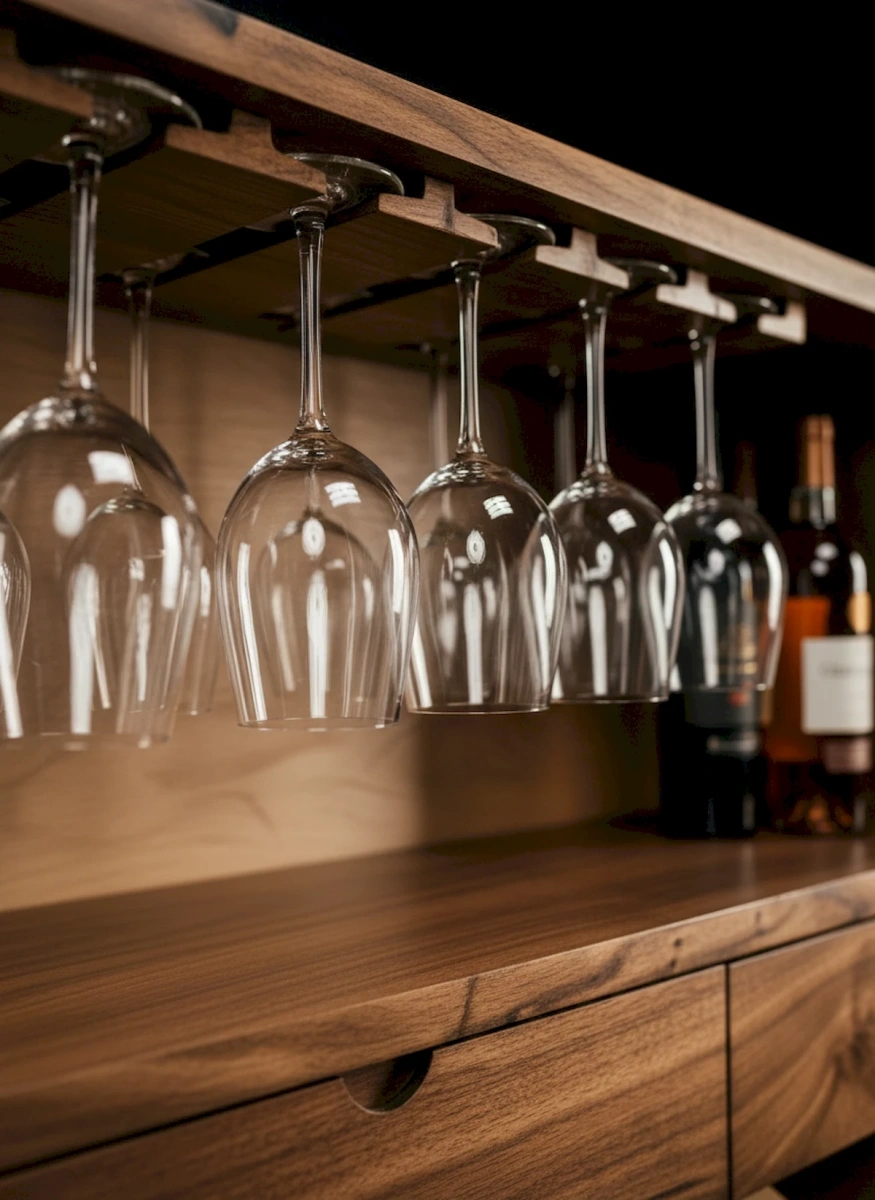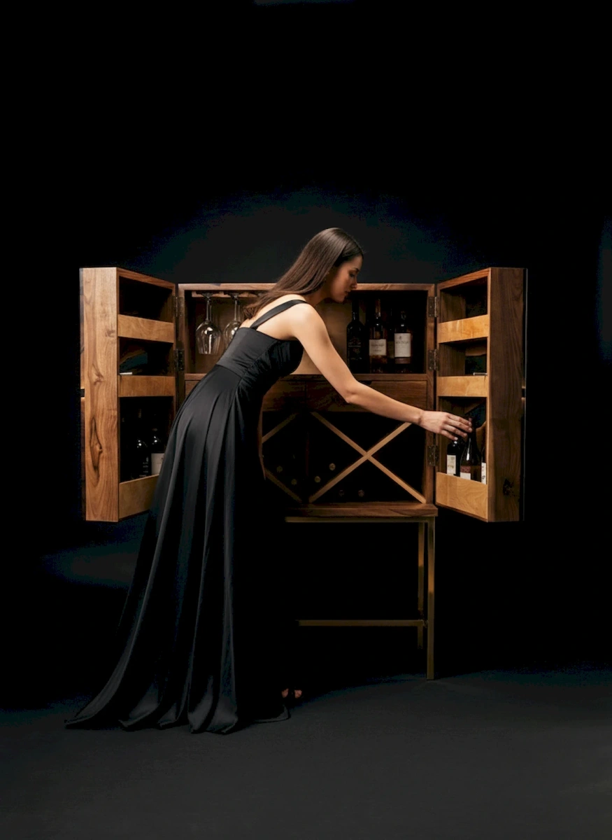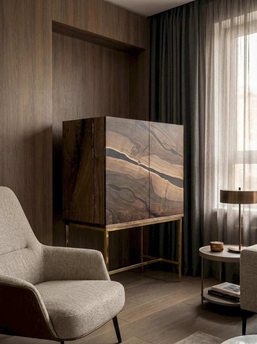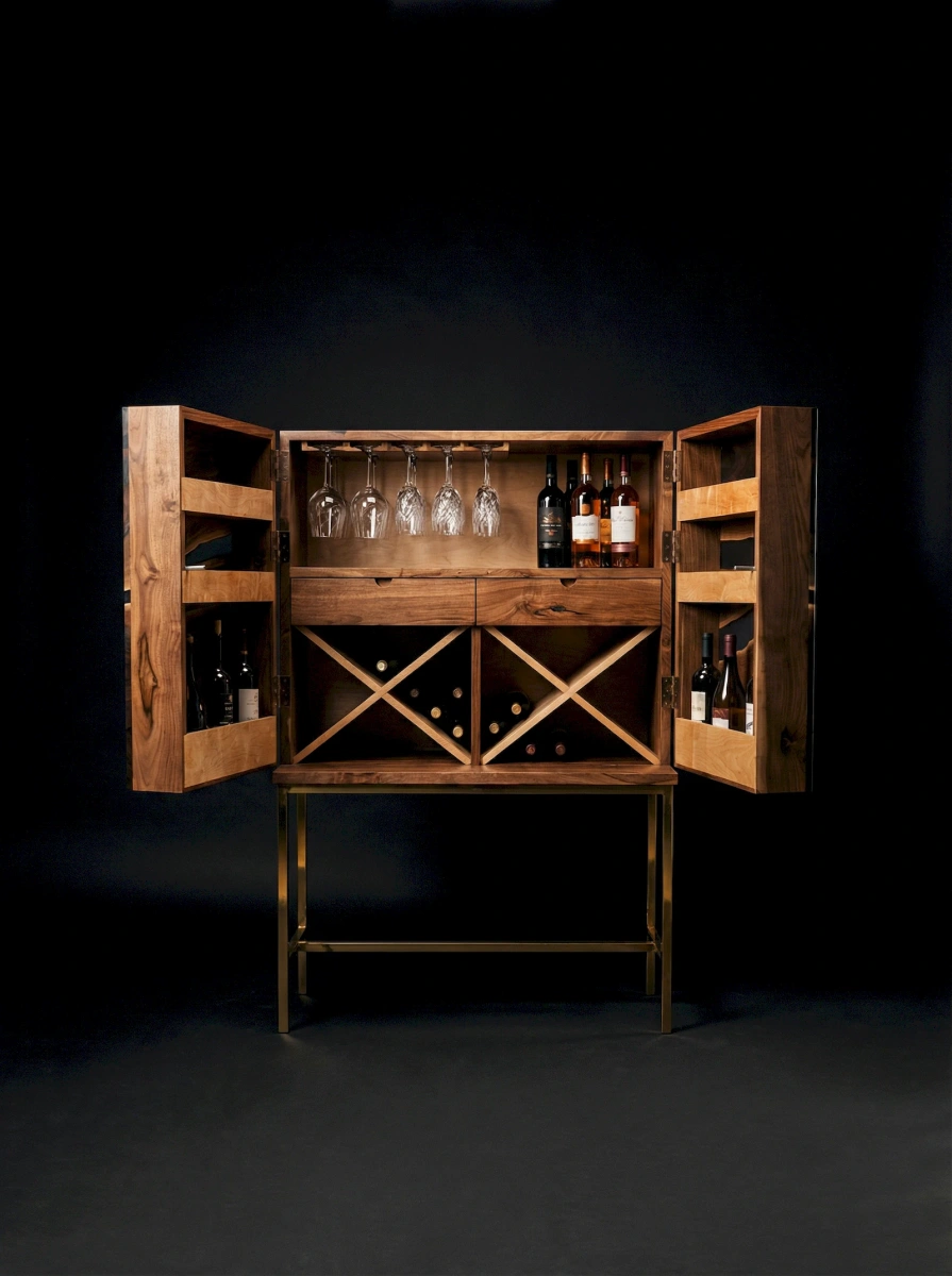 Еще одна эксклюзивная работа от наших мастеров, винный шкаф из массива Американского ореха (черное дерево), в сочетании с темной эпоксидной смолой. При изготовлении фасадов применялся очень редкий и оригинальный материал. Лицевая сторона изделия выглядит просто потрясающее и притягивает взгляд снова и снова. Все детали изделия прошли несколько стадий ручной шлифовки и полировки. Внутри шкафа вы найдете для себя все необходимое для размещения вашего кухонного сервиза и напитков. Финишное покрытие выполнено полиуретановым лаком для придания дополнительной прочности поверхности изделия. Габарит шкафа: 150 см, длина 90 см, глубина изделия 53 см. Открывание фасадов осуществляется нажатием, механизм push to open. Основание данной модели возможно сделать под заказ по вашим индивидуальным пожеланиям.