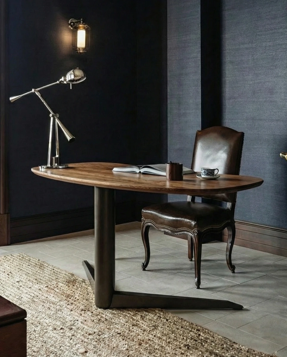 - Mid-century modern — овальная форма, сочетание дерева и металла, лаконичность — всё это перекликается с принципами этого стиля. Стол будет хорошо смотреться в кабинете с ретро-акцентами и тёплой цветовой гаммой.