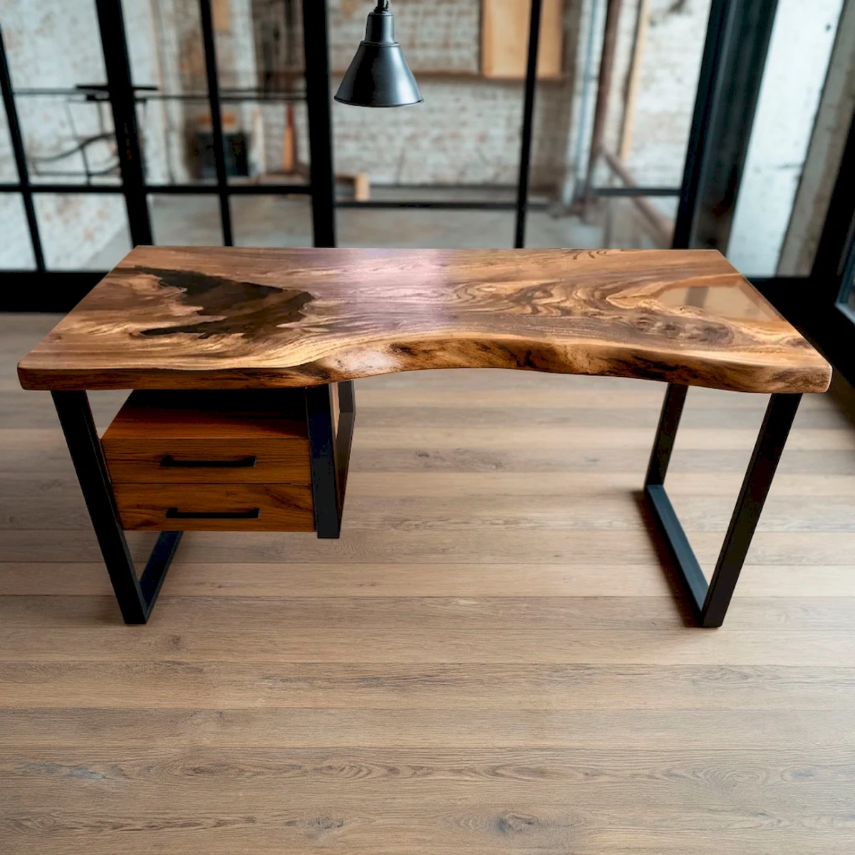 Вашему вниманию представлен уникальный дизайнерский стол из массива карагача. За основу изделия был взят уникальный слэб, после всех процедур по обработке он заиграл новыми красками и готов притягивать ваш взгляд снова и снова. Изделие великолепно впишется в вашу рабочую зону, а времяпрепровождение за таким объектом подарит великое множество положительных эмоций. В данном столе мы можем увидеть идеальное сочетание различных материалов: дерева, металла и эпоксидной смолы. Выдвижные ящики оборудованы фурнитурой полного выдвижения марки Blum. Возможно полностью е изготовление.