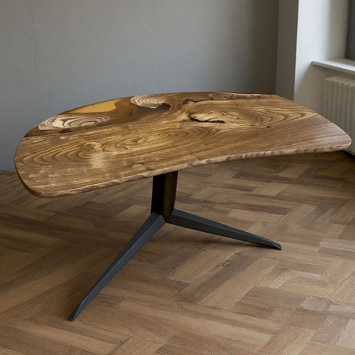 Элегантная столешница выполнена из эксклюзивной заготовки массива горного вяза/карагача с красивыми природными расщелинами, которые залиты эпоксидной смолой янтарного оттенка и создают неповторимый рисунок. Идеально гладкая поверхность, обработанная экологичными маслами, приятна на ощупь. Легкое металлическое основание подчеркивает красоту натурального дерева и делает конструкцию устойчивой.
