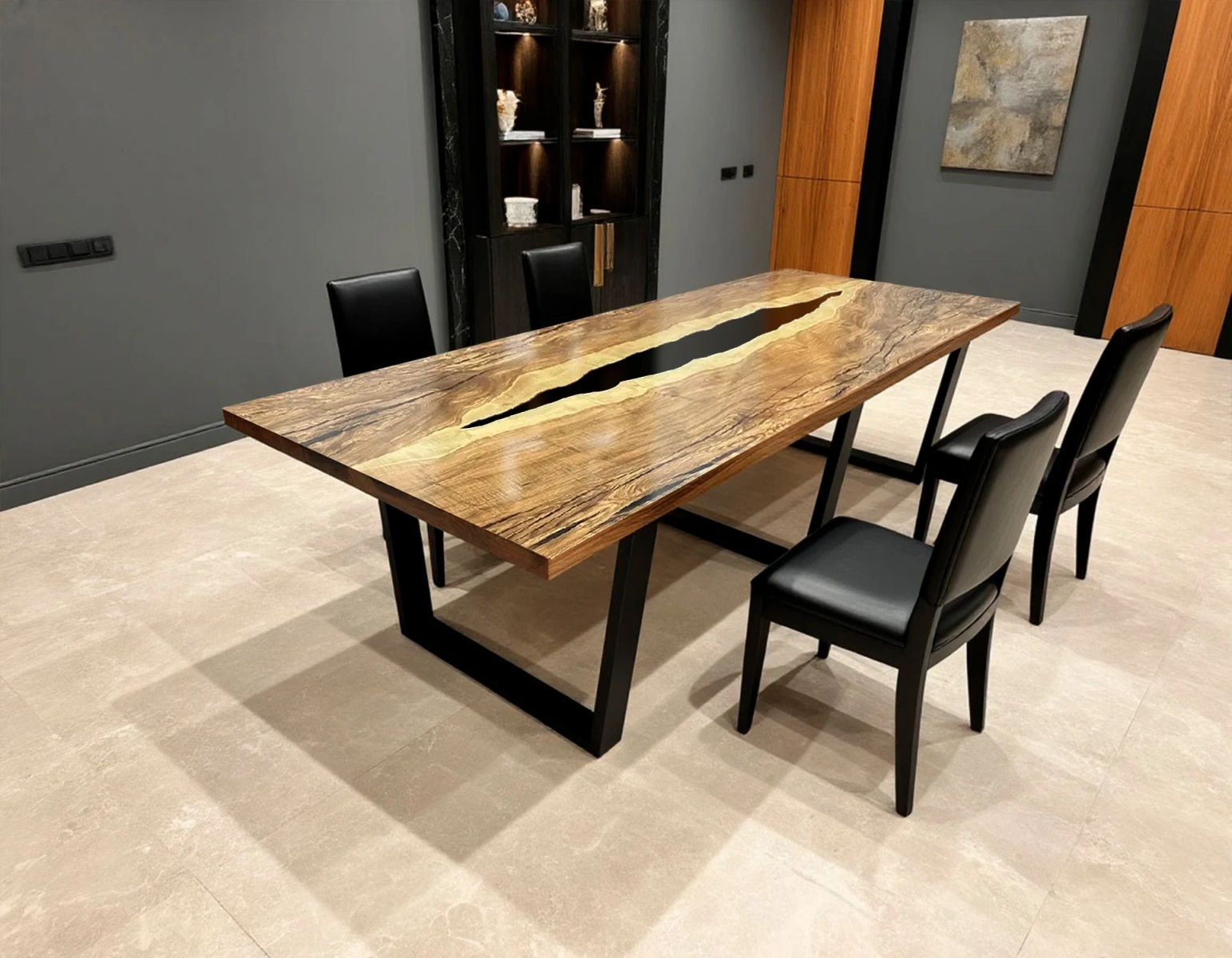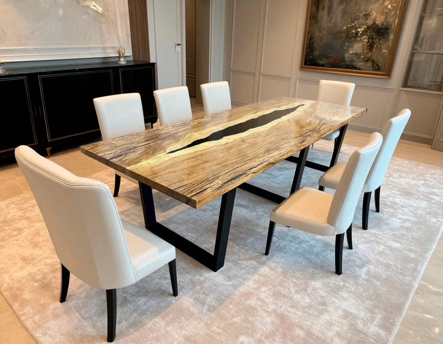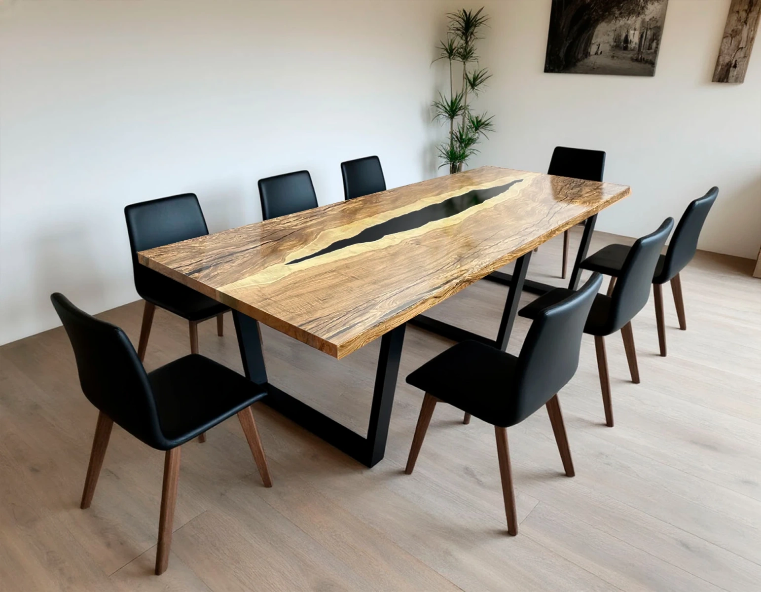 - Дизайн-изюминка: центральная заливка чёрной эпоксидной смолы, имитирующая русло реки. Контраст между тёплыми оттенками ясеня и глубокой чёрной смолой создаёт выразительный визуальный эффект.