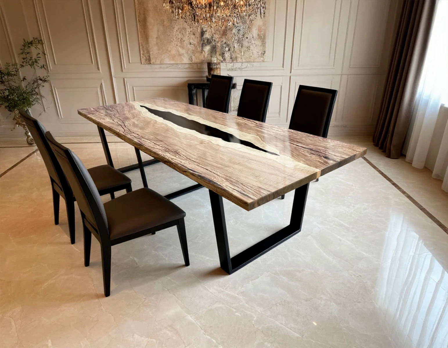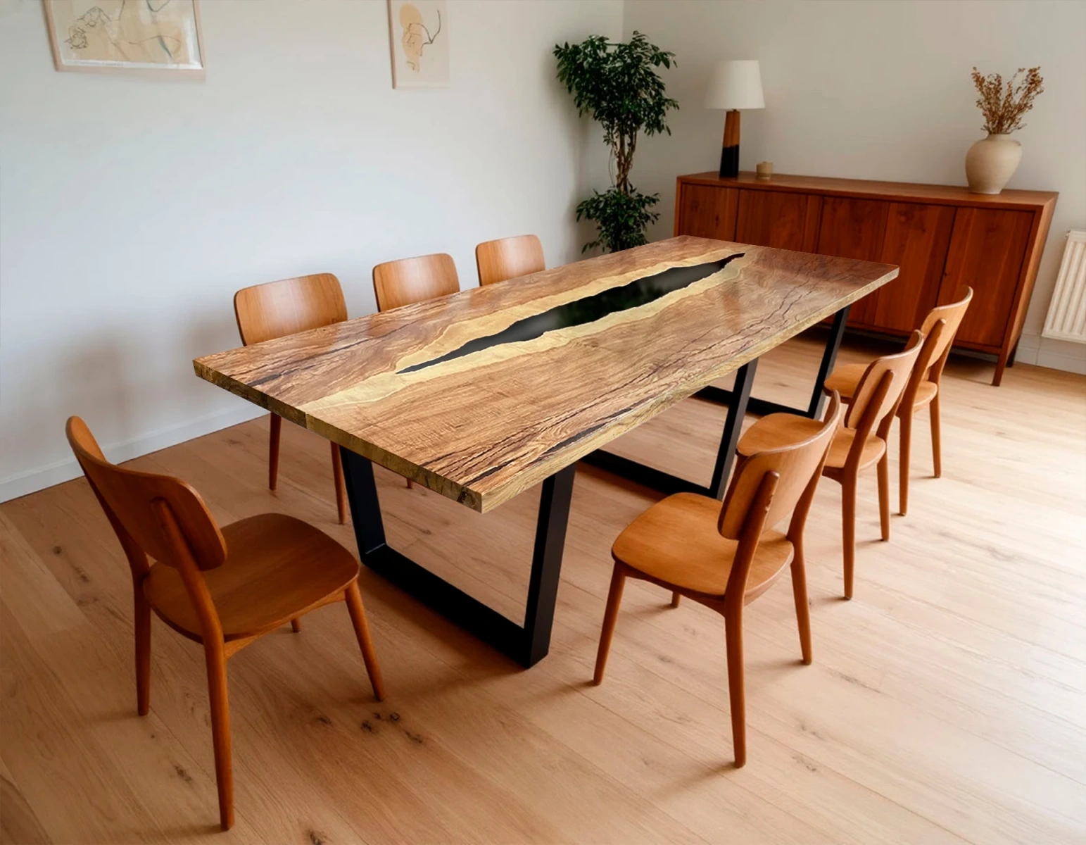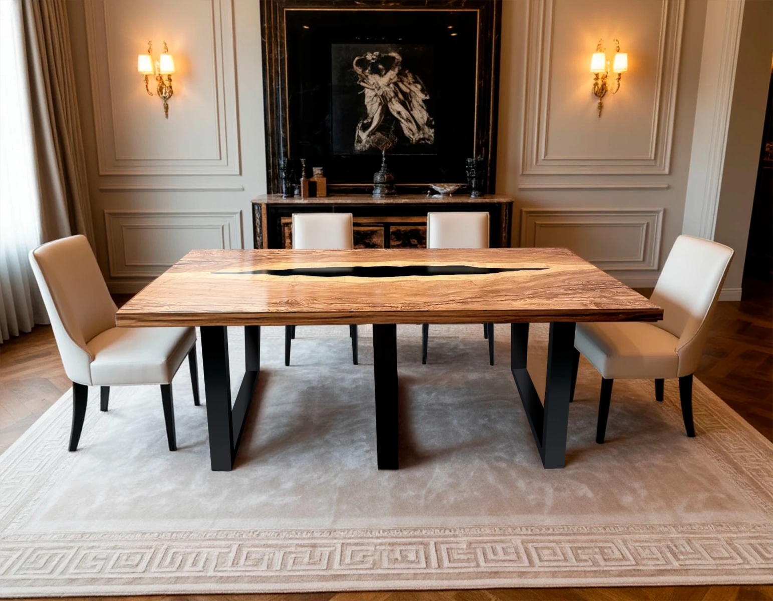 - Дизайн-изюминка: центральная заливка чёрной эпоксидной смолы, имитирующая русло реки. Контраст между тёплыми оттенками ясеня и глубокой чёрной смолой создаёт выразительный визуальный эффект.