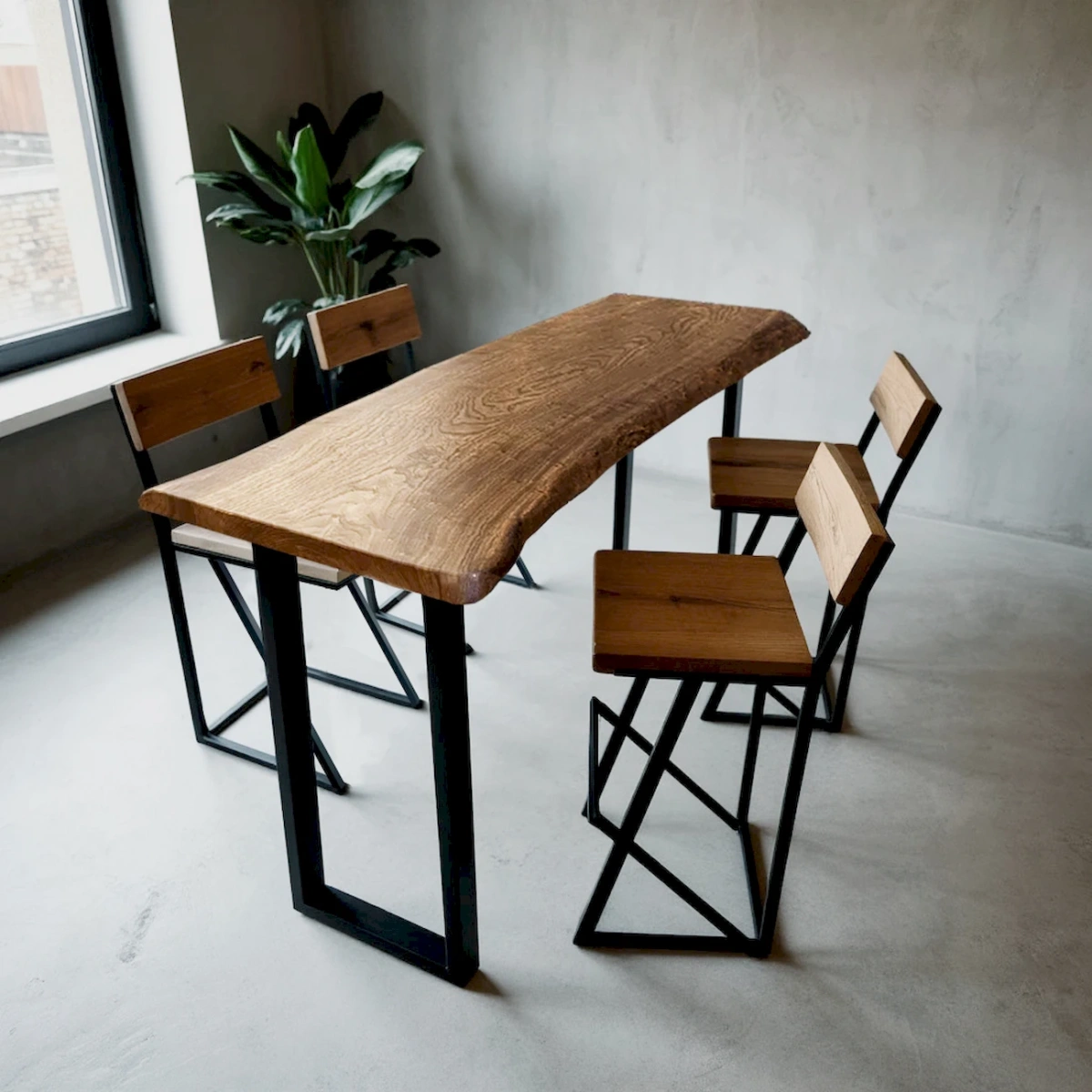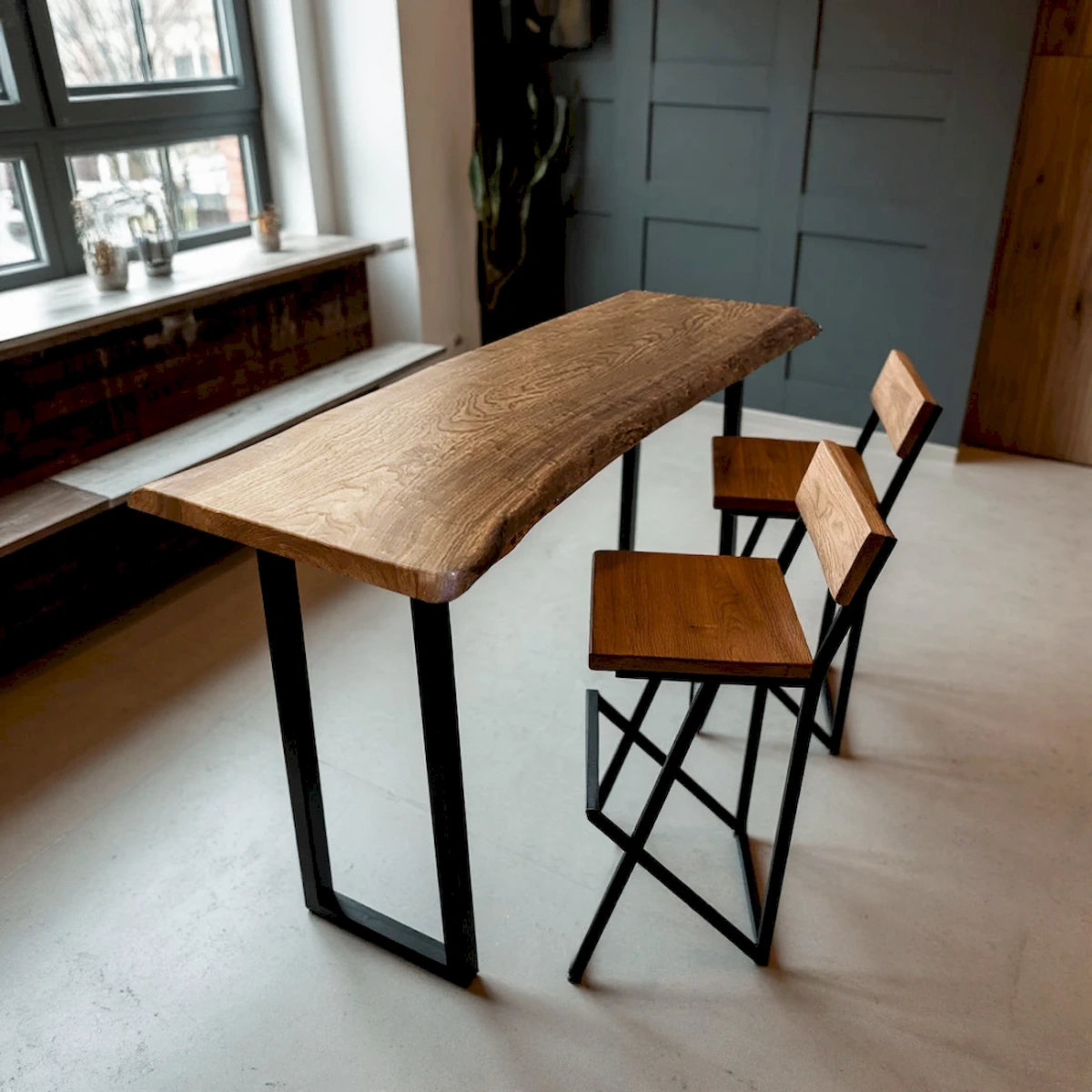 - Индустриальный стиль — металлические ножки и массив дерева подчёркивают индустриальную эстетику, хорошо сочетаются с бетонными поверхностями, металлическими аксессуарами и грубыми текстурами.