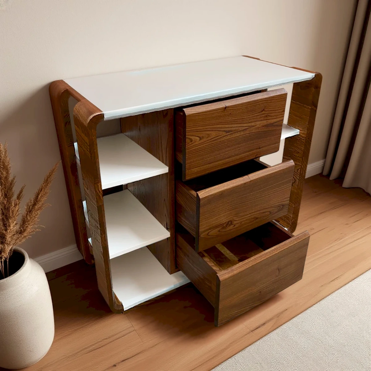 - Эстетика: Плавные изогнутые линии боковин, чистые формы и отсутствие лишнего декора делают комод динамичным и универсальным.