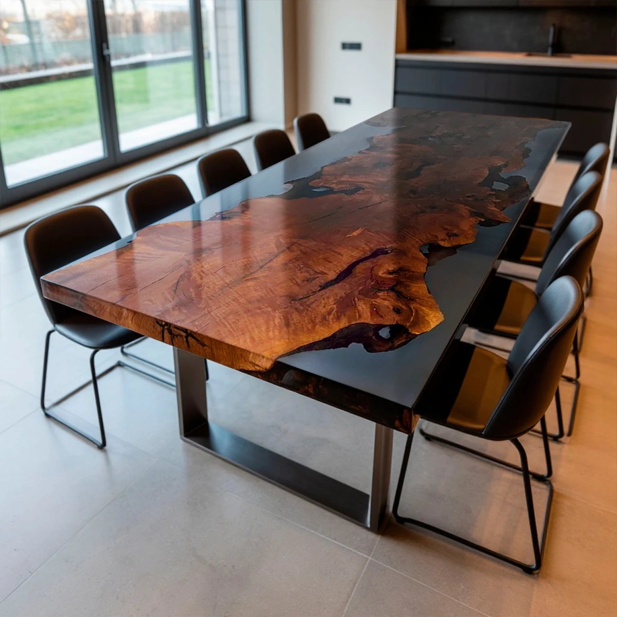 Представляем эксклюзивный обеденный стол «Luxury Wood» — настоящий шедевр мебельного искусства, который стацентром притяжения и украшением вашей столовой или кухни. Этот стол выполнен из отборного термо-граба и эпоксидной смолы глубокого черного оттенка. Сочетание природной красоты дерева с современными материалами создает неповторимый эффект. Прозрачная смола позволяет рассмотреть каждую деталь: причудливый рисунок волокон, живые сучки и природные переходы. Поверхность идеально отшлифована до зеркального глянца, а устойчивое основание из листового металла завершает лаконичный и современный дизайн.