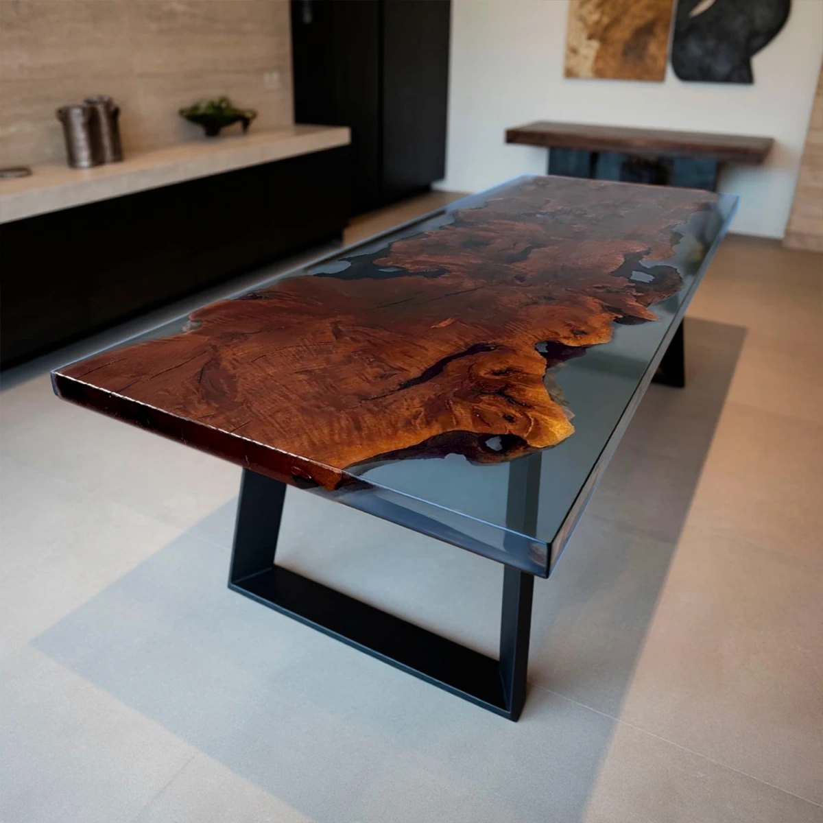 Столешница изготовлена из цельного слэба термо-граба с выразительным природным рисунком. Уникальная текстура подчёркнута заливкой эпоксидной смолы, которая создает эффект «реки», протекающей по поверхности. Каждый стол — неповторимый арт-объект, двух одинаковых изделий не существует.