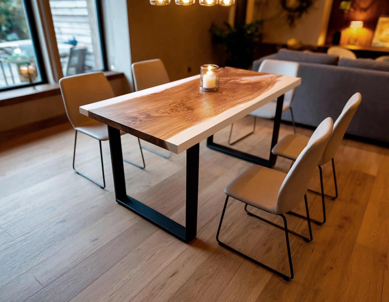 Представляем эксклюзивный обеденный стол размером 145 × 80 см, созданный для вашей семьи. Его основа — уникальный слэб массива горного вяза с выразительной текстурой, обрамленный непрозрачной эпоксидной смолой белого цвета «Молоко». Это идеальное сочетание природной теплоты дерева и лаконичной современности, рассчитанное на 4–6 персон.