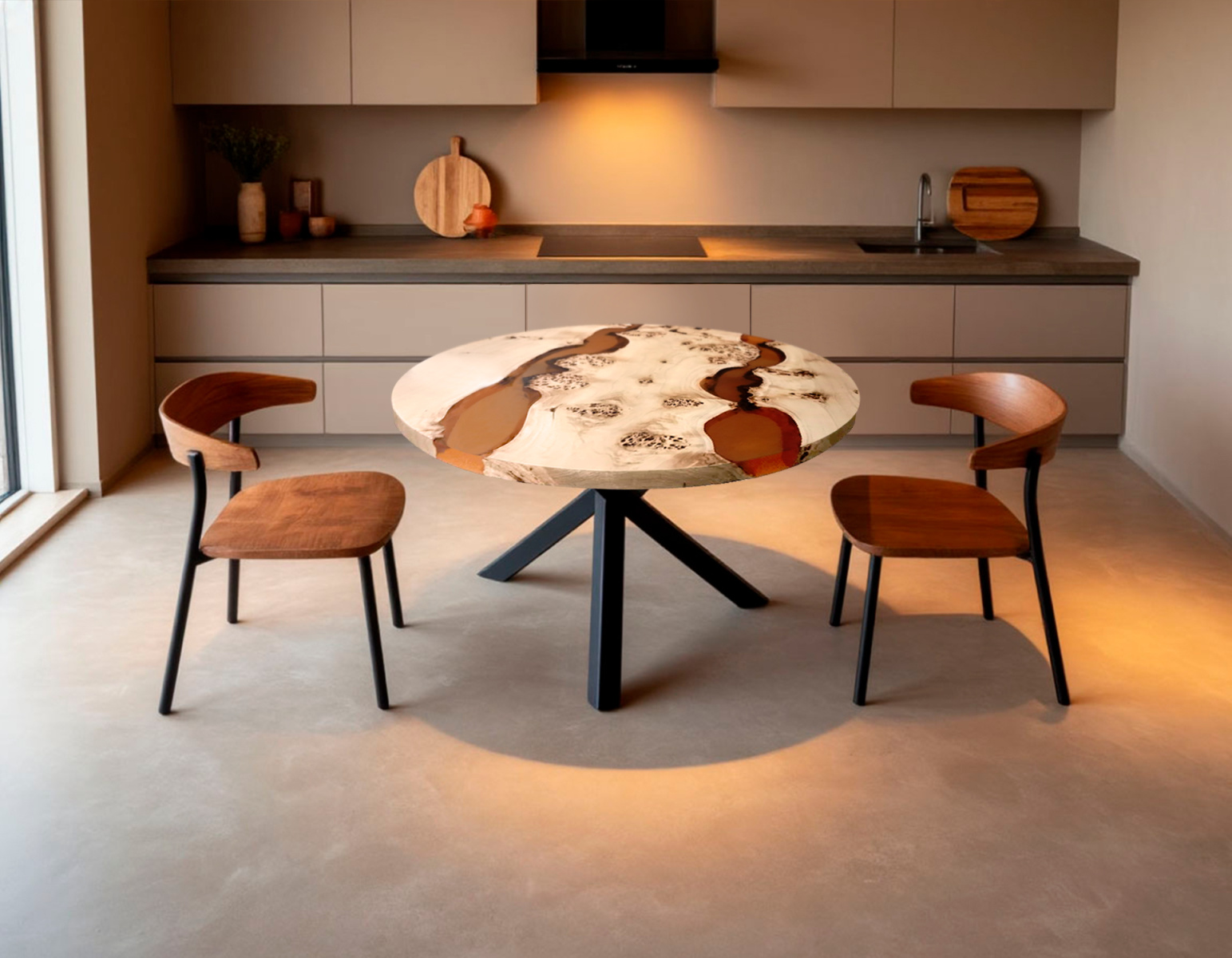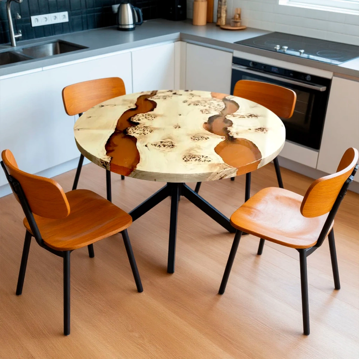 Уникальный круглый стол из слэба тополя с эпоксидными "реками" станет центральным элементом вашей обеденной зоны. Сочетание натуральной древесины и современных материалов создает эффектный контраст, подчеркивающий красоту природы.