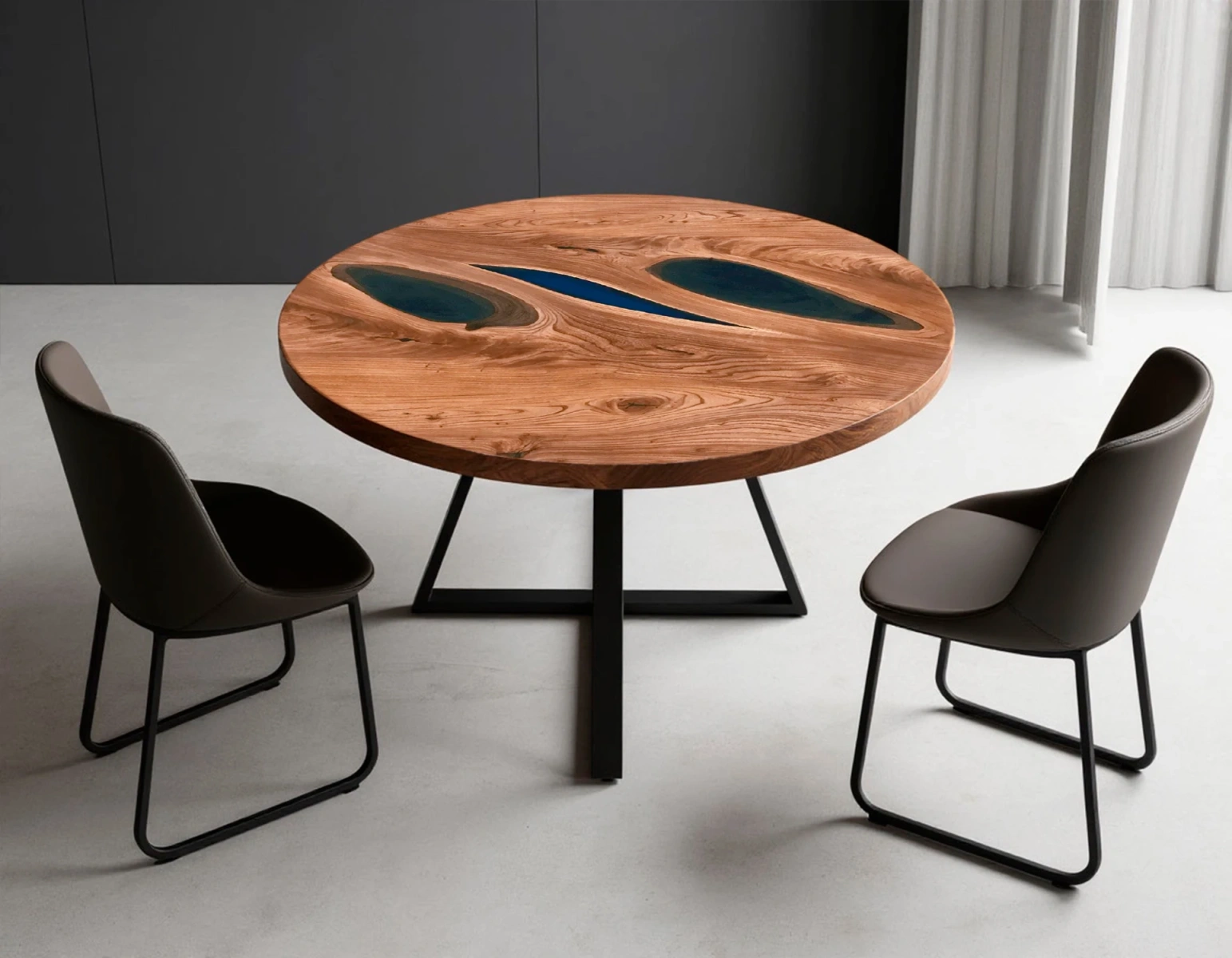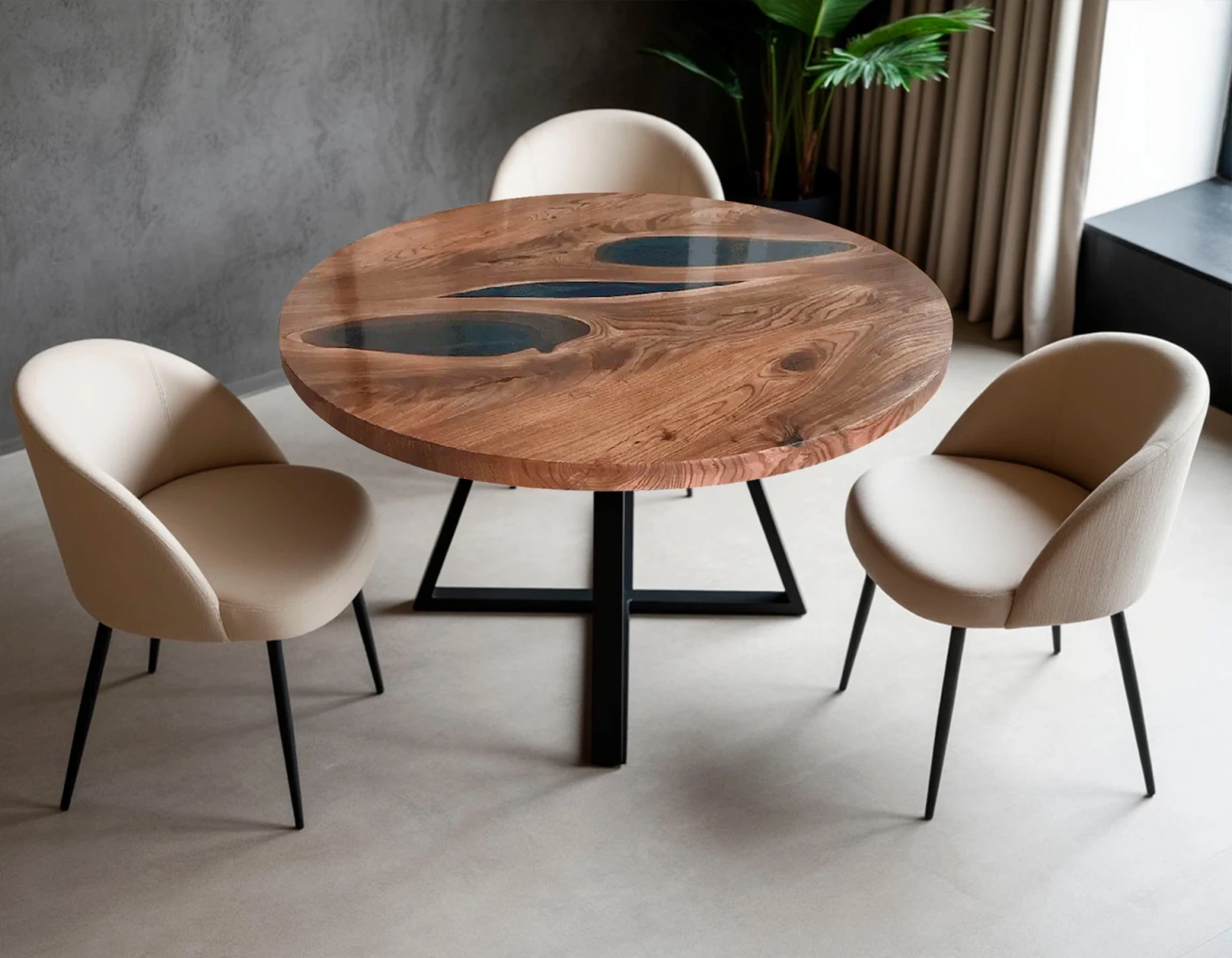 Представляем вашему вниманию эксклюзивный круглый обеденный стол «Два озера» диаметром 120 см — идеальное решение для уютной трапезы на 4 персоны! Это изделие сочетает в себе природную красоту массива карагача и современный дизайн с художественной заливкой эпоксидной смолой ярко-синего цвета.