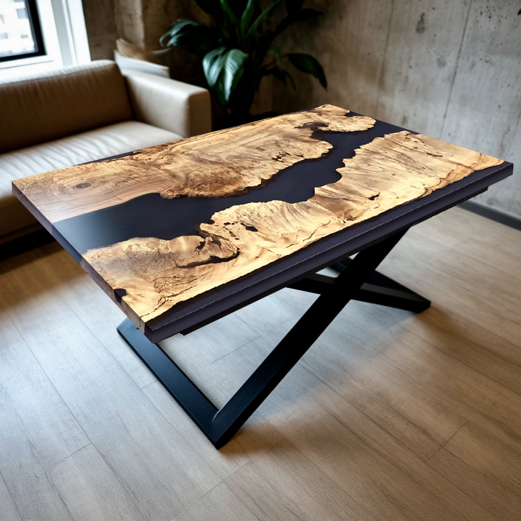 Сочетание грубоватой фактуры дерева, индустриального металла подстолья и современной эпоксидной смолы идеально соответствует духу лофта и индустриального стиля. Х-образные ножки и контраст материалов сделают стол выразительным центром пространства с кирпичными стенами и бетонными фактурами.
