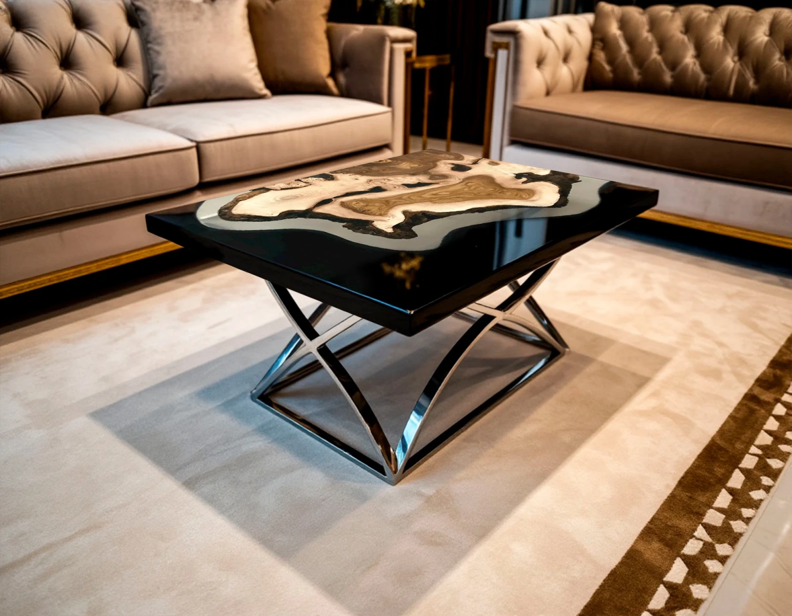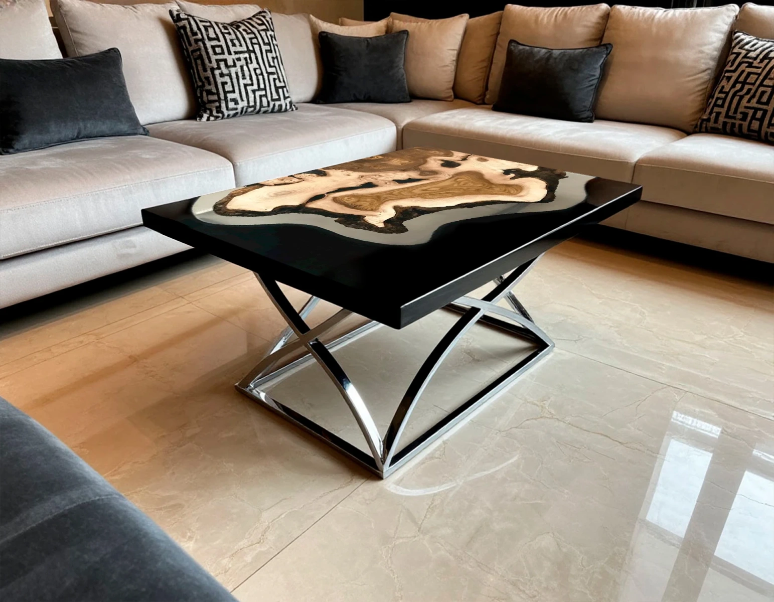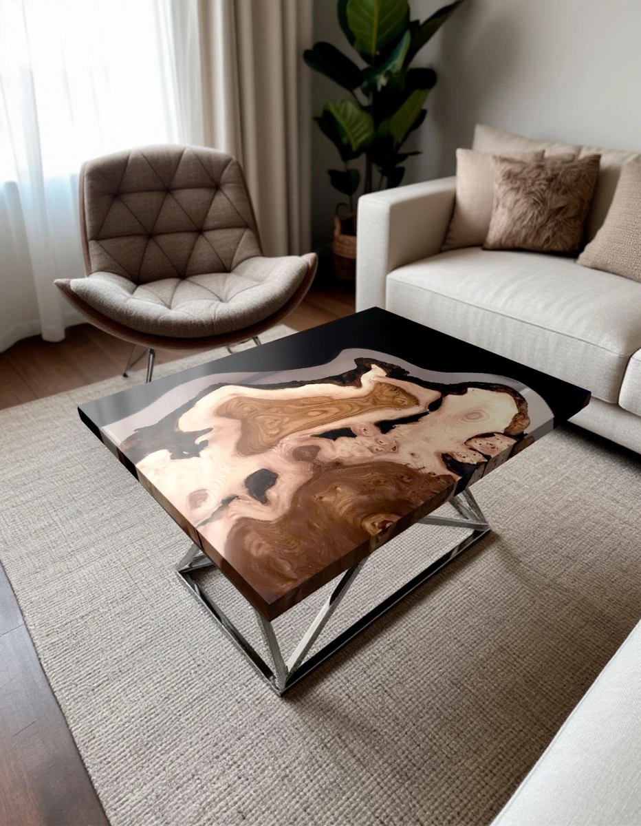- Цвет и контраст: глубокий чёрный цвет смолы эффектно оттеняет тёплые природные оттенки карагача, создавая выразительный визуальный эффект, который делает стол из слэба центральным элементом комнаты.