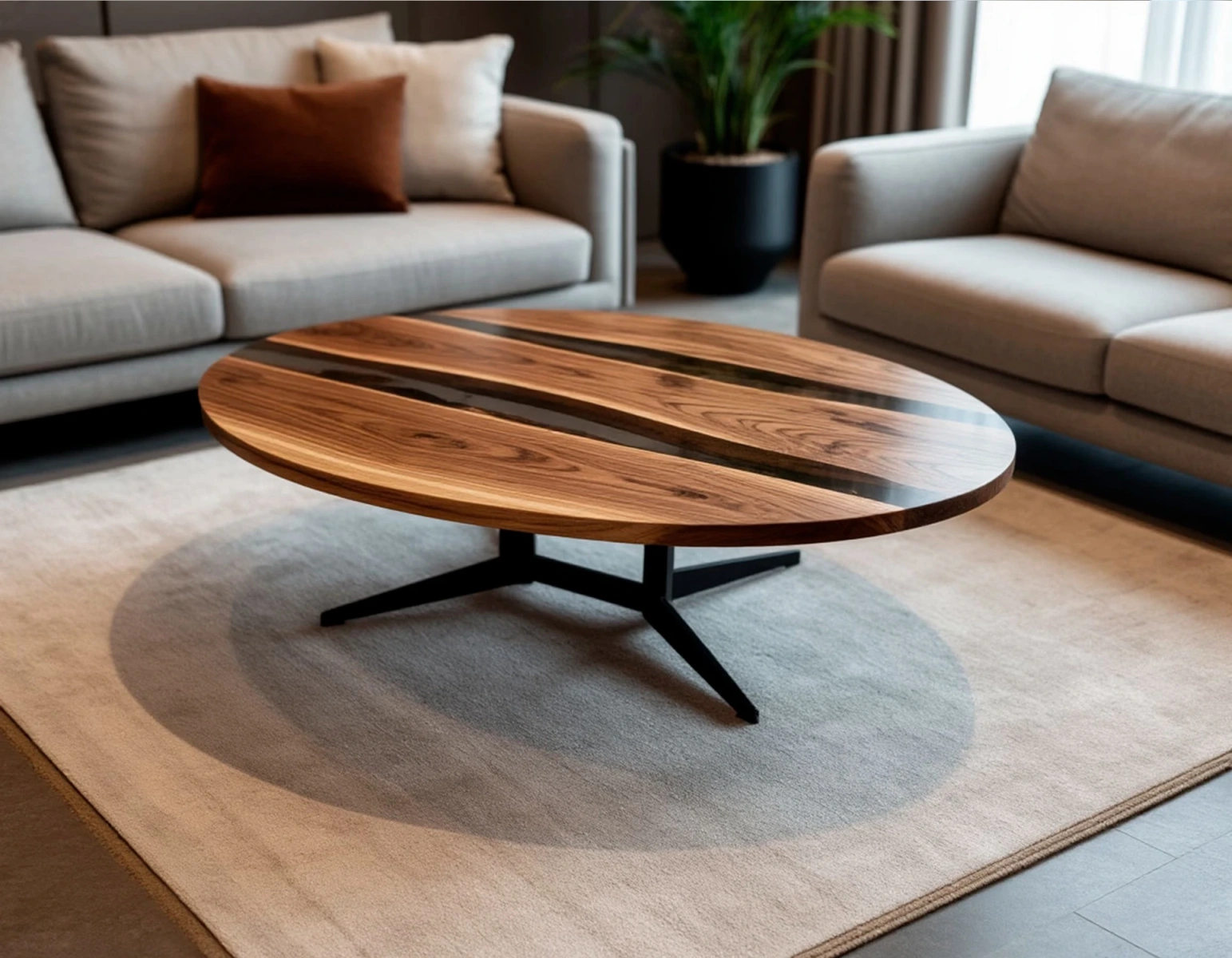 - Футуризм: сочетание натурального дерева и современных материалов (эпоксидная смола, металлическое подстолье) создаёт ощущение инновационности и технологичности, характерное для футуристических интерьеров.