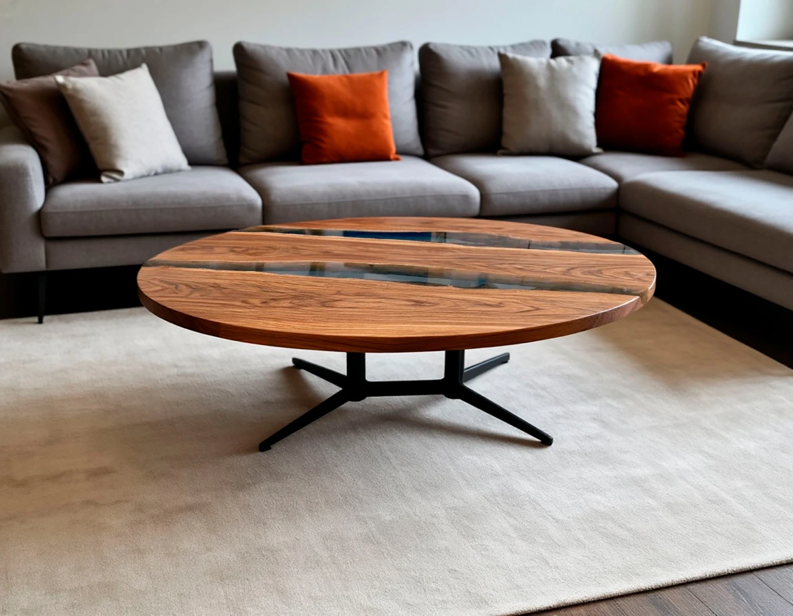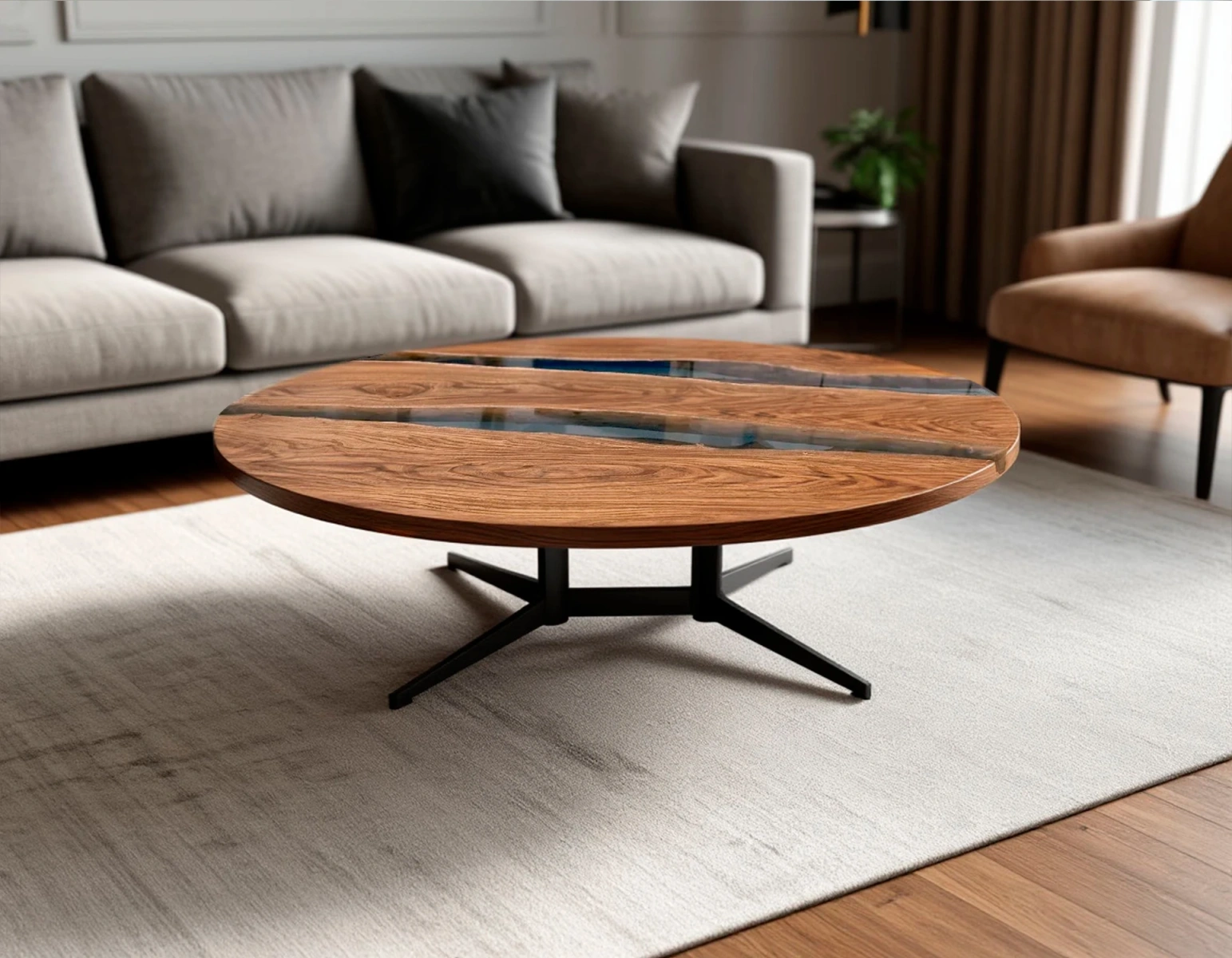 Представляем вашему вниманию изысканный овальный журнальный стол «Forest River» — центральный акцент современного интерьера. Это уникальное изделие ручной работы, где природная красота древесины горного вяза встречается с художественной заливкой из эпоксидной смолы нежно-голубого оттенка.