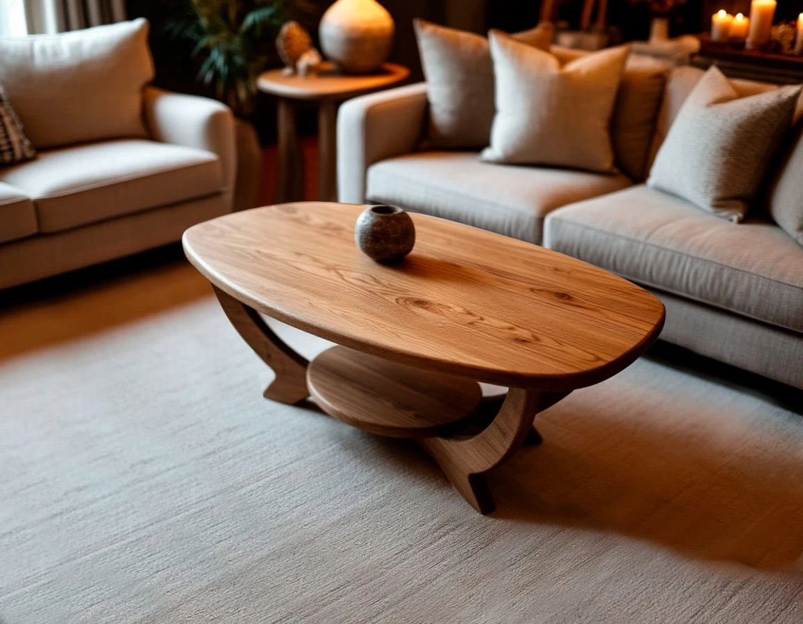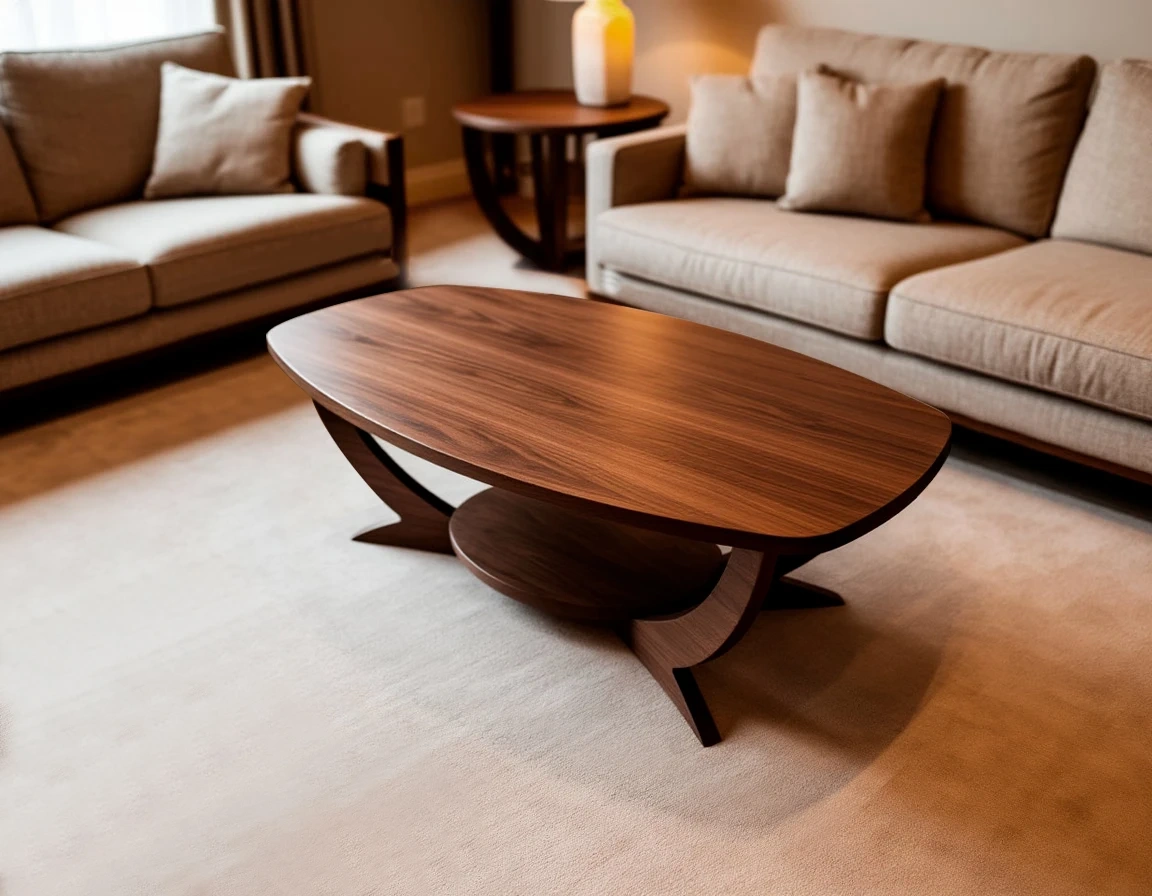 - Форма: овальная столешница с плавными линиями создаёт ощущение лёгкости, безопасности и визуальной гармонии. Такая форма идеально подходит для гостиной — она практична и визуально расширяет пространство.