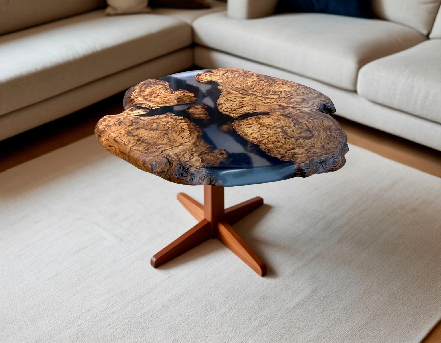 - Эпоксидная смола: тёмная заливка подчёркивает глубину древесных прожилок, создаёт эффект «реки», прорезающей лесной массив. Контраст между тёплым деревом и холодной смолой придаёт изделию особую выразительность и защищает поверхность от повреждений.