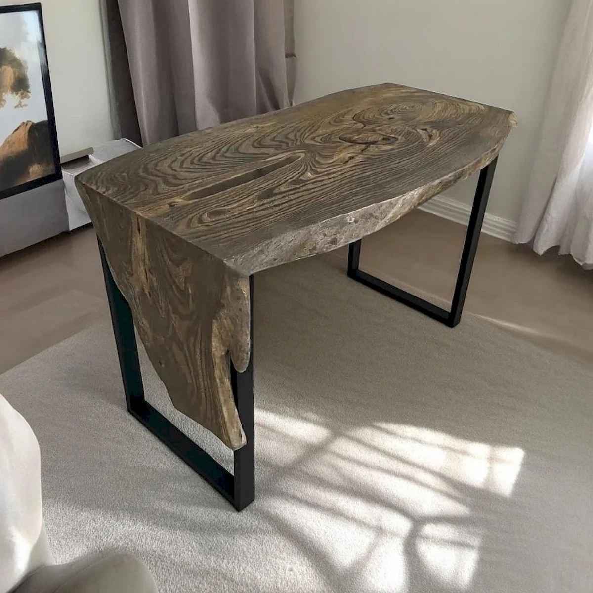 Столешница: Выполнена из цельного слэба массива карагача (или другой твердой породы дерева). Отличается живым, выразительным рисунком древесины с уникальными волнистыми линиями и текстурой.