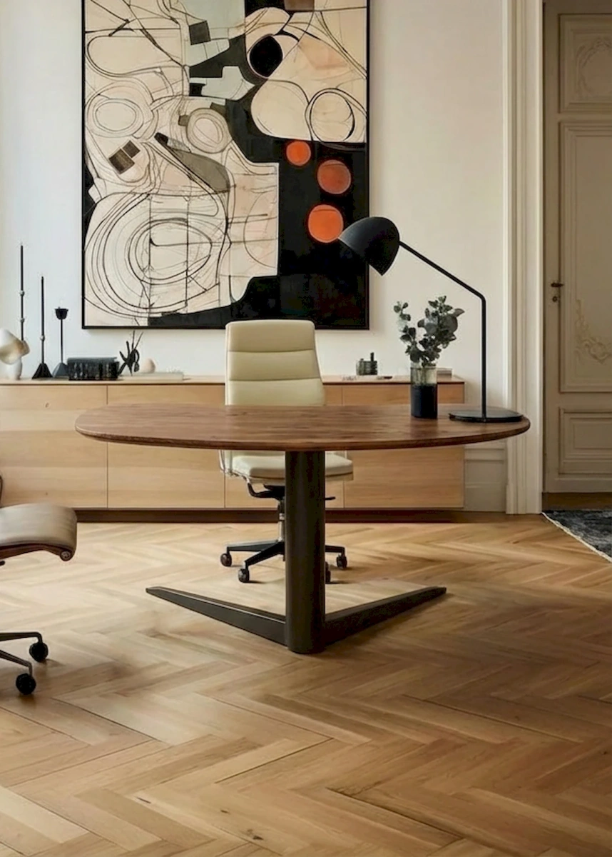 Современный (Modern) и Минимализм: Лаконичная форма, чистые линии и сочетание дерева с металлом. Не перегружает пространство, подчеркивает его упорядоченность.