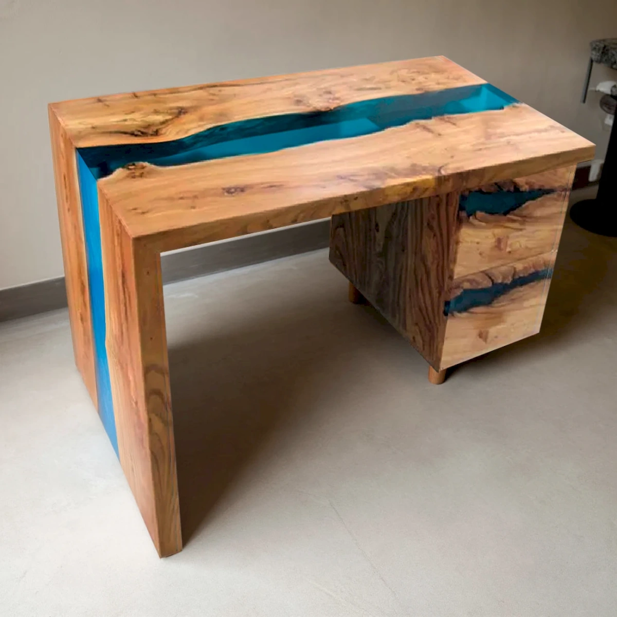 Уникальный и очень оригинальный письменный стол в стиле "Река" от наших мастеров. Данная модель была изготовлена из массива карагача, но возможны различные варианты исполнения, тонировка древесины и смолы может быть различной. Каждая деталь стола прошла несколько стадий ручной шлифовки и полировки, поверхность очень приятная при тактильных прикосновениях. Финишное покрытие изделия выполнялось водным лаком, что придаст поверхности лучшие показатели износостойкости. Ящики оборудованы фурнитурой марки Blum с полным выдвижением. Возможно полностью индивидуальное изготовление по всем ваших требованиям и пожеланиям.