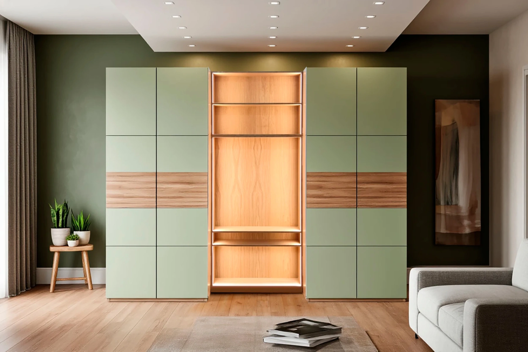 - Комбинация материалов: Натуральное дерево полок сочетается с гладкими фасадами пастельного оттенка.