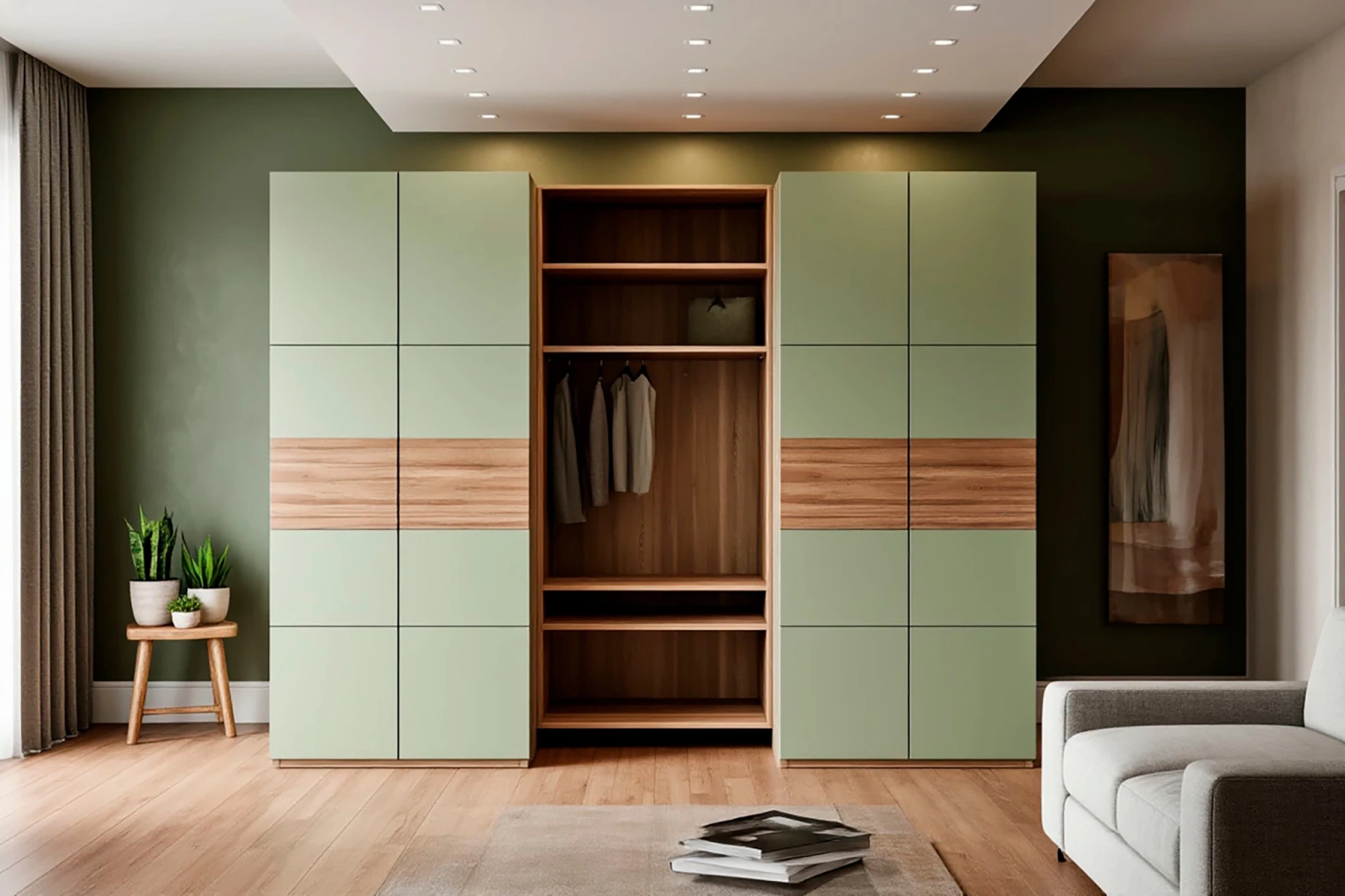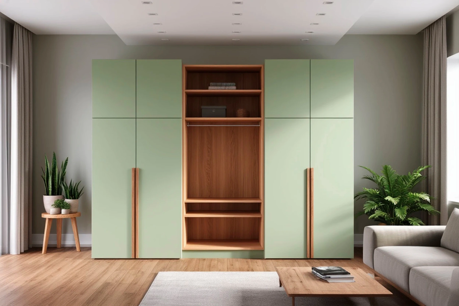Симметричная композиция: Две закрытые секции по бокам и открытая центральная часть создают уравновешенный и лёгкий вид.