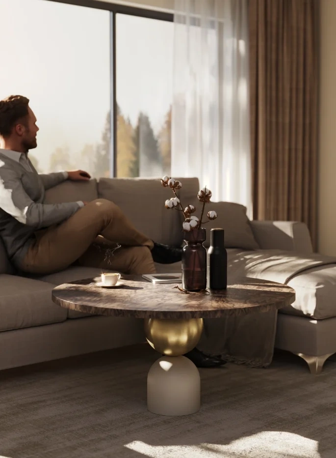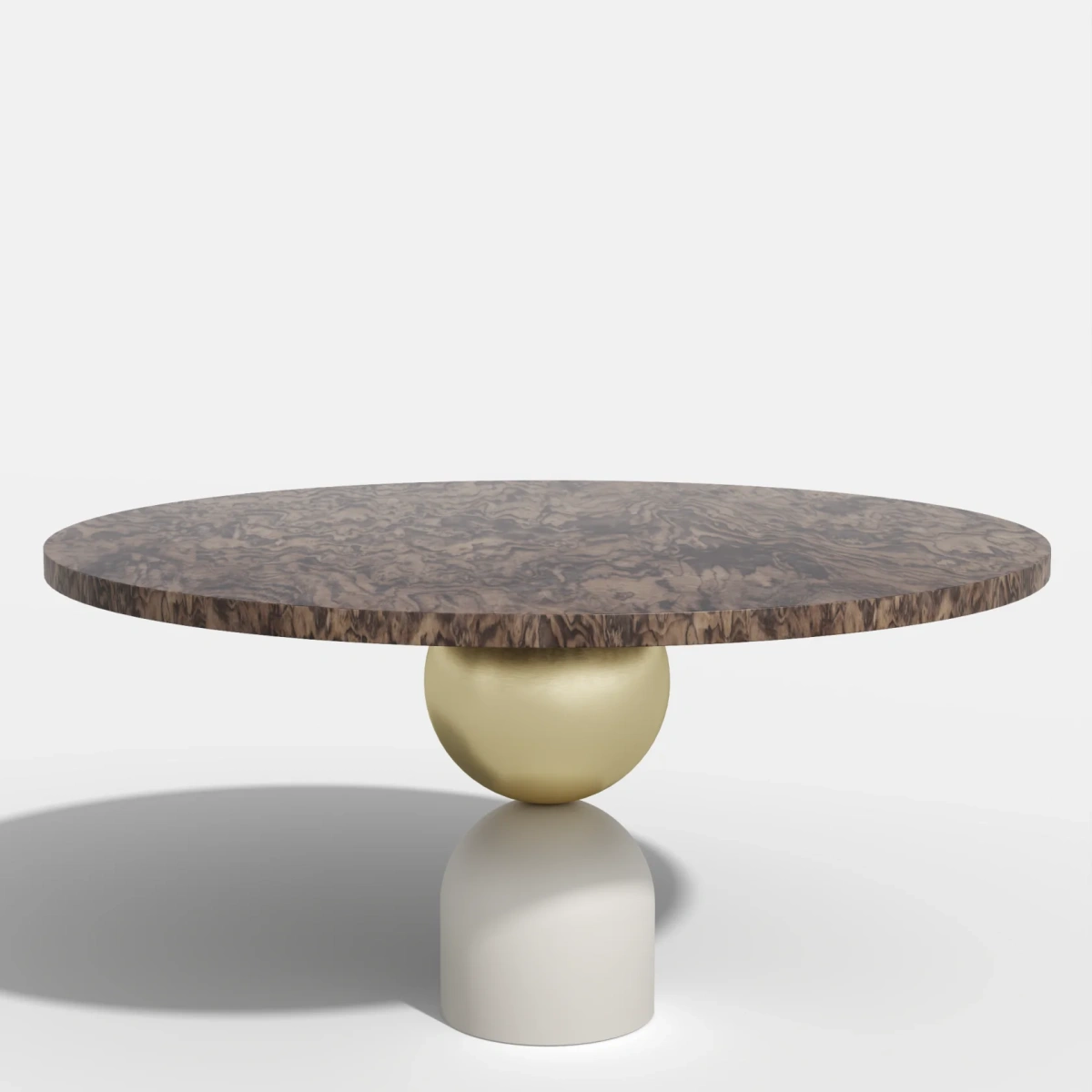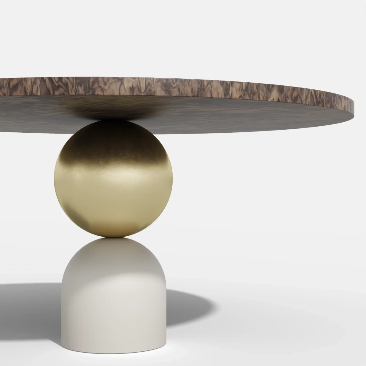 Этот большой круглый столик диаметром 90 см станет изысканным акцентом интерьера. Столешница из шпона корня северо-американского ореха придаёт благородный натуральный рисунок, а текстурированное золото "шампань" в отделке создаёт эффект драгоценного металла.