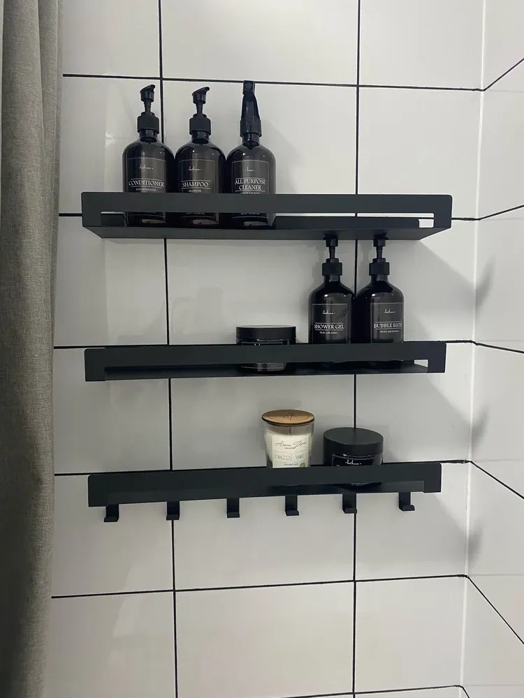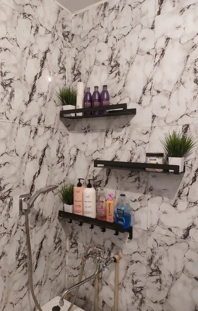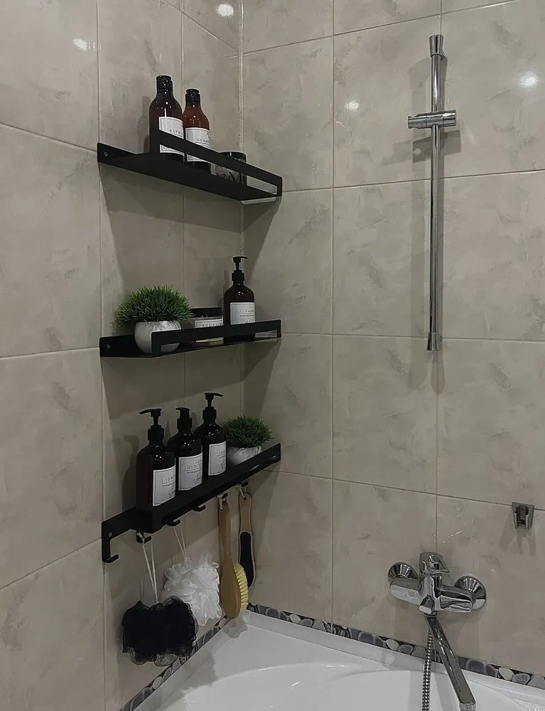 В малогабаритной ванной — полки для шампуней + крючки для мочалок