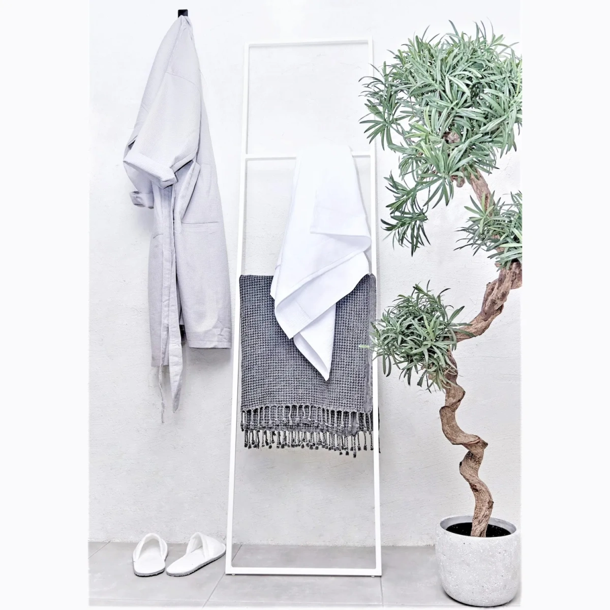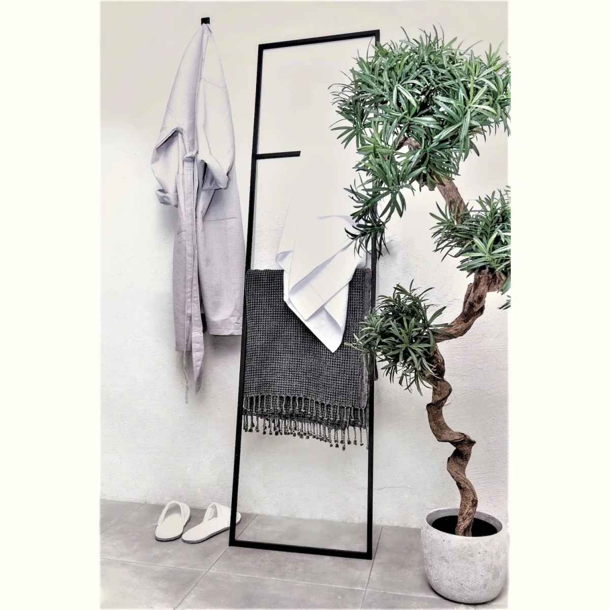 Стеллаж MyOry Towel представляет собой универсальное решение для хранения полотенец и белья в ванной комнате, бане или других помещениях. Приставная конструкция не требует крепления к стене — достаточно прислонить каркас к опорной поверхности. Влагостойкое исполнение позволяет использовать стеллаж как внутри помещений, так и на открытом воздухе.