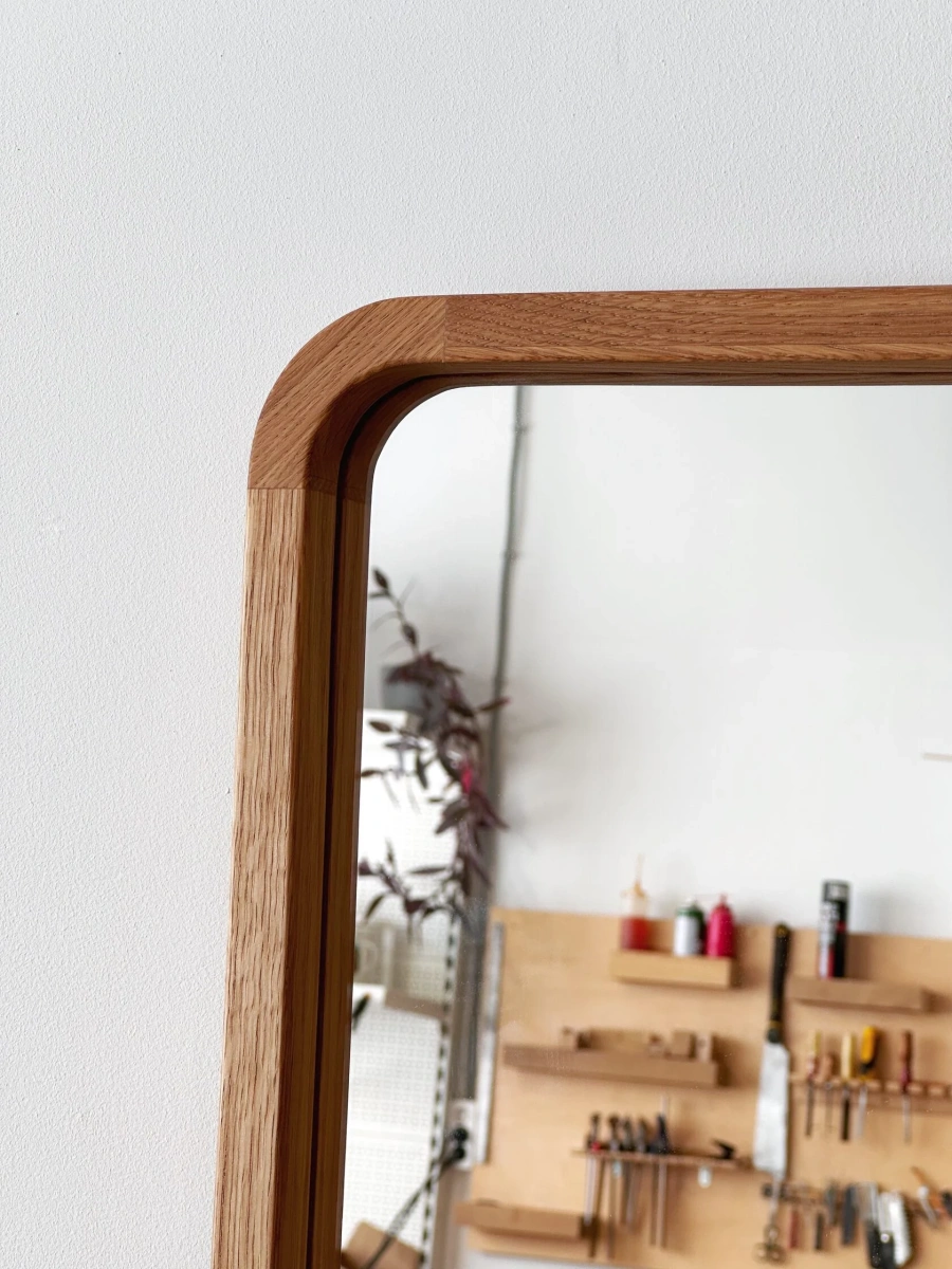 Зеркало «Глянь» — лаконичное и функциональное решение для интерьера. Прямоугольная форма с мягко закруглёнными углами придаёт изделию современный вид. Рамка выполнена из светлого дерева, что добавляет тепла и естественности. Большое зеркальное полотно идеально подходит для размещения в коридоре, спальне или рядом со шкафом — оно не только практично, но и визуально расширяет пространство. Минималистичный дизайн делает зеркало универсальным элементом декора.