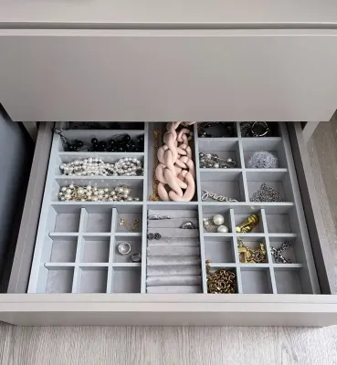 Два выдвижных ящика на скрытых направляющих Blum Tip-On с системой push-to-open для бесшумного и удобного открывания без ручек.