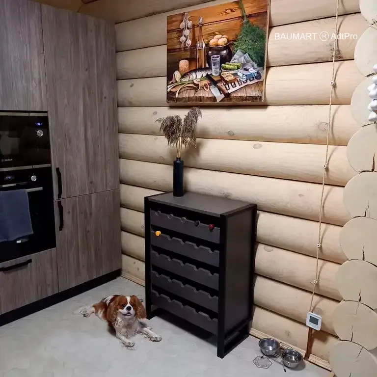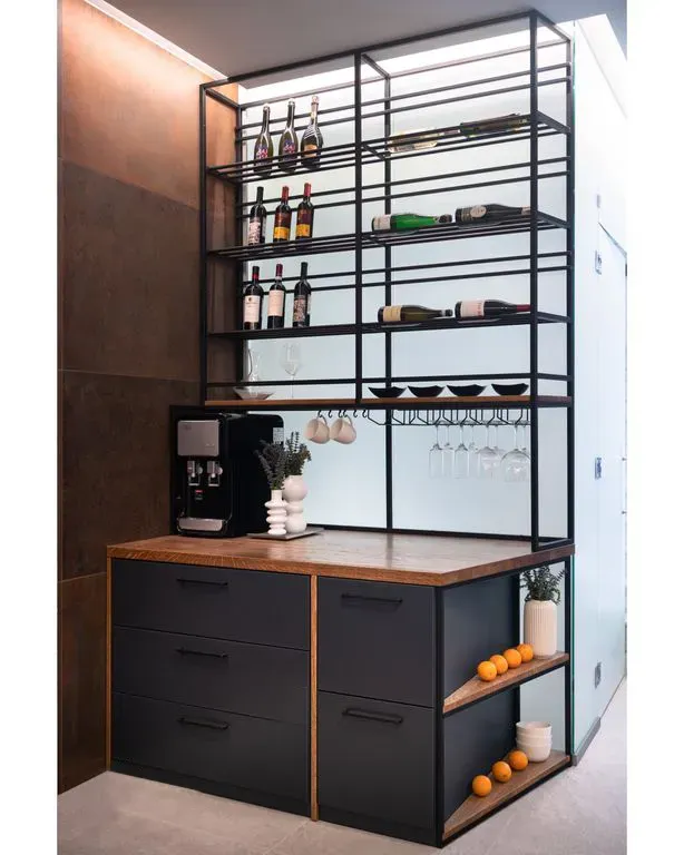 Барный модуль в стиле лофт с винным стеллажом Этот барный модуль сочетает в себе индустриальную эстетику стиля лофт и функциональность современной мебели для хранения. Нижний ярус состоит из двух просторных тумб с выдвижными ящиками для приборов, закрытыми шкафчиками и открытыми полками для винных бутылок, объединенных массивной столешницей из дуба. Подвесной стеллаж с держателями для бокалов и...