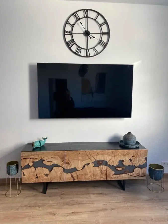 Абсолютно каждая тумба нашего производства уникальна и изготавливается по всем пожеланиям заказчика. Представленная модель тумбы под тв из слэба клена с эпоксидной смолой.