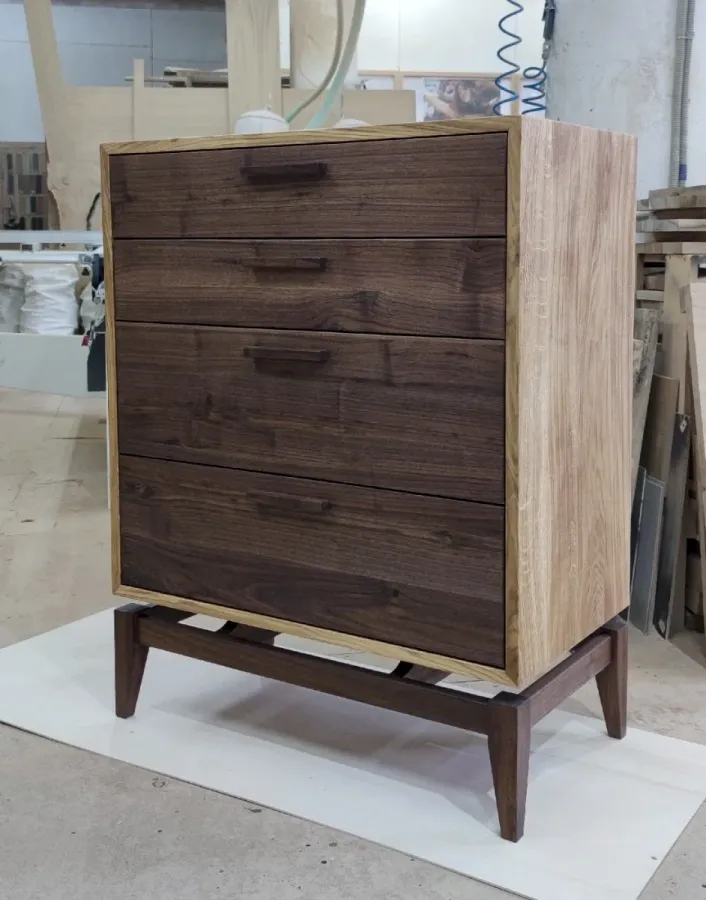 Великолепный комод с четырьмя выдвижными ящиками из комбинации различных пород массива дерева в исполнении нашей команды мастеров - очень эффектный и практичный в эксплуатации.