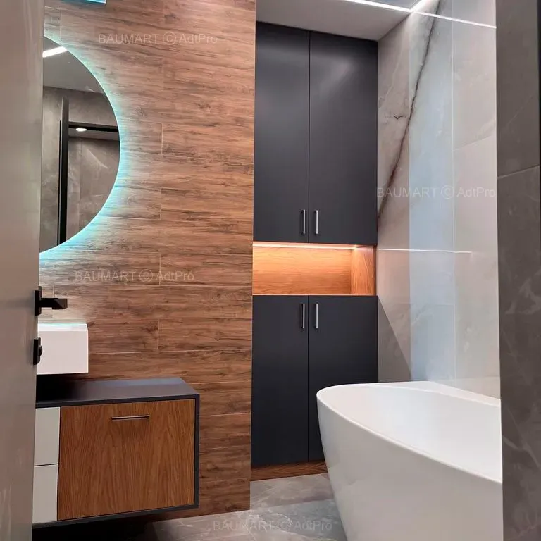 Создание современного дизайн-проекта ванной комнаты требует внимательного подхода к выбору цветовой гаммы и форм. Прямые линии и благородный темно-серый цвет в интерьере ванной комнаты придают помещению элегантность и стиль. Мрамор цвета древа становится идеальным акцентом, который гармонично сочетается с основным фоном.