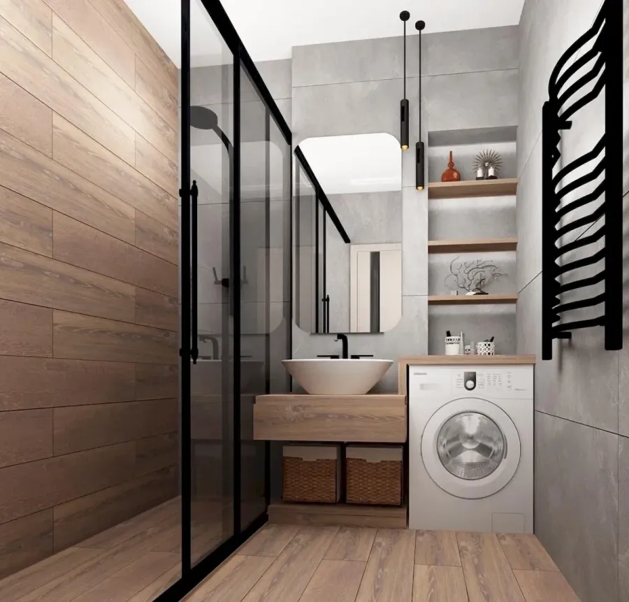 Представляем готовый проект оформления ванной комнаты и санузла, в котором гармонично соединены три современных стиля: строгий минимализм, натуральный эко-стиль и брутальный лофт. Этот дизайн превратит ваше пространство в функциональное и эстетичное произведение искусства.