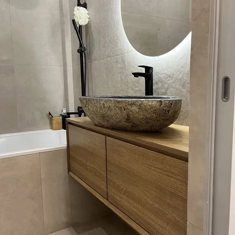 Дизайн-проект ванной комнаты: Аристократичный минимализм в серых тонах с дубом