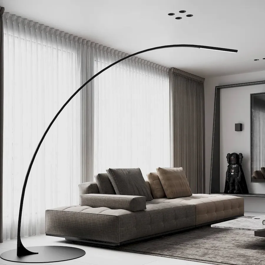 Дизайн: изящная дугообразная конструкция, напоминающая плавающую линию света. Лаконичный силуэт без лишних деталей делает этот торшер настоящим украшением интерьера.