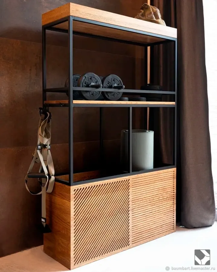 Устали от разбросанного по углам спортивного оборудования? Наш деревянный стеллаж в стиле лофт создан специально для решения этой проблемы. Это многоуровневая система хранения, которая объединяет все ваши тренировочные принадлежности в одном месте.