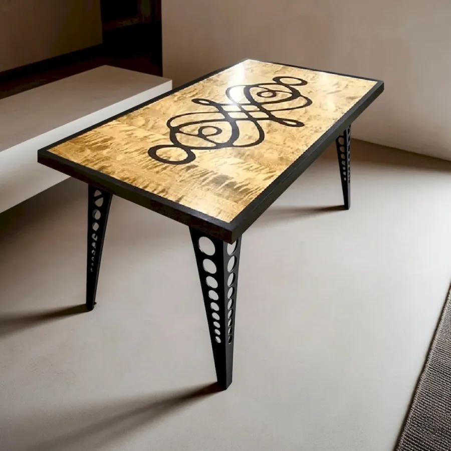 Этот обеденный стол — выразительное дизайнерское решение для современного интерьера. Модель в стиле лофт изготовлена из пламенной березы и украшена контрастным орнаментом из черной смолы в сочетании с темной каймой. Завершает образ комплект новых декоративных металлических ножек.