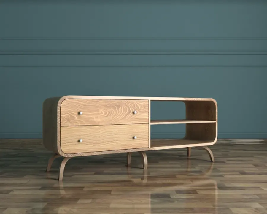 Комод под ТВ с ящиками и стеллажом из массива ясеня Лаконичный и функциональный комод под телевизор, совмещающий два выдвижных ящика и открытый стеллаж из двух секций. Изделие выполнено из массива дерева со шпонированным фасадом ясеня, что обеспечивает природную теплоту, прочность и долговечность. Изящные гнутые ножки и чистые линии делают эту модель универсальным решением для современной гостиной. Дизайн...