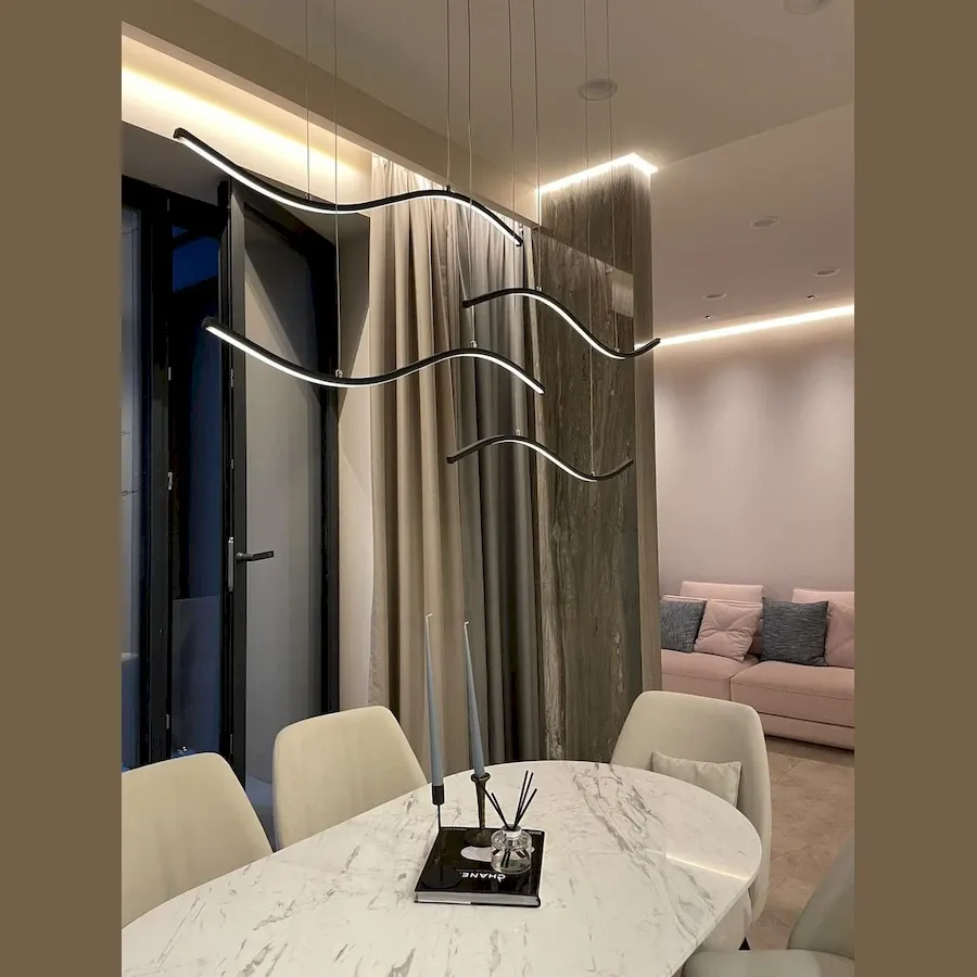 Подвесной светильник WaveLamp с волнообразной конструкцией — синтез искусства и передовых технологий в освещении Изящные изогнутые линии, напоминающие волны, создают динамичный, но гармоничный визуальный эффект. Дизайн сочетает минимализм и футуризм.Корпус выполнен из высокопрочного алюминия с матовой чёрной отделкой.Источник света — интегрированные LED-модули, обеспечивающие равномерное рассеянное...