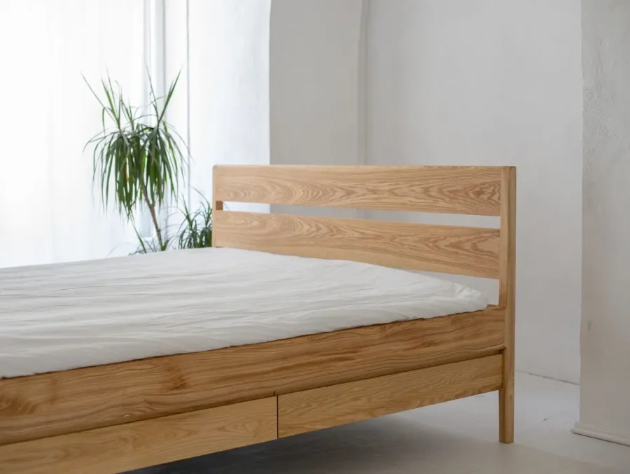 Элегантная двуспальная кровать из натурального массива дерева, оснащенная удобной системой хранения — выдвижными ящиками для белья. Это идеальное сочетание лаконичной эстетики, экологичности и практичной функциональности для современной спальни.