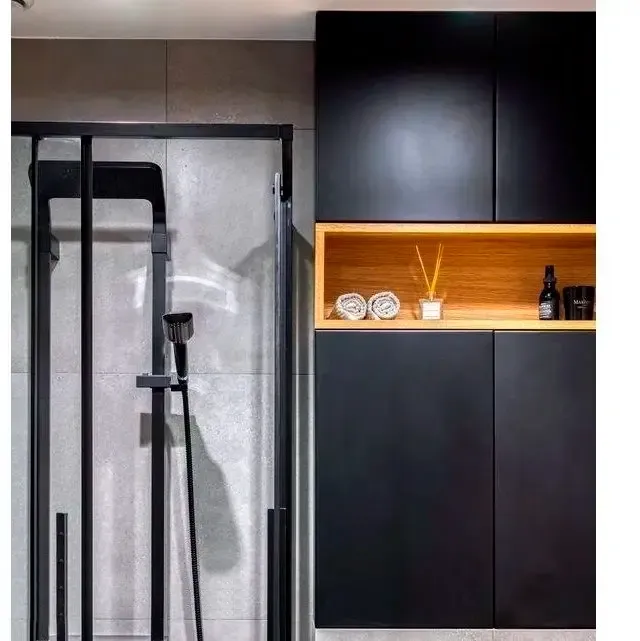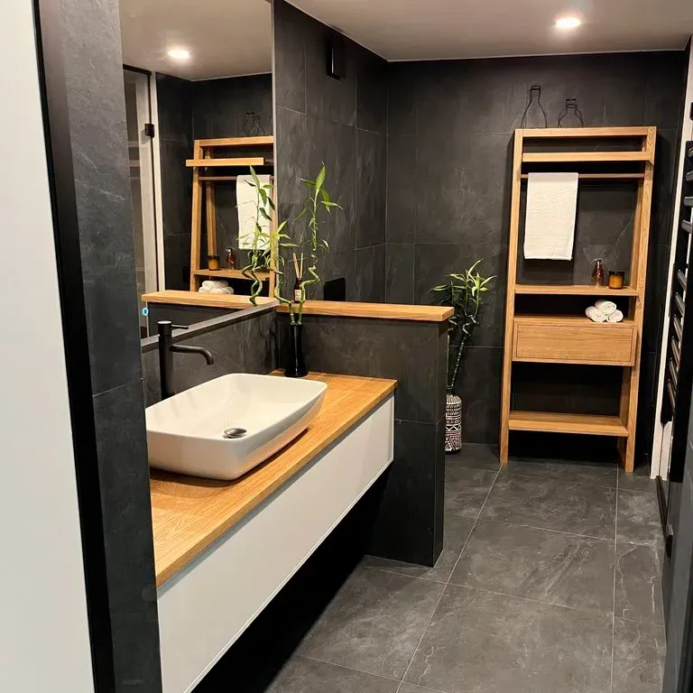 Дизайн ванной комнаты в темных тонах - это смелое и стильное решение, которое придает интерьеру особый шарм и элегантность. Черная плитка, выбранная в качестве основного материала для отделки стен и пола, создает эффектный контраст с природной структурой дерева и мебелью с белым фасадом.