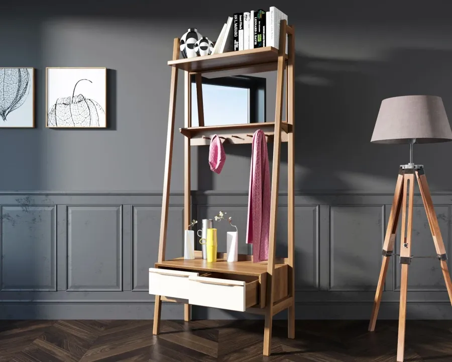 Функциональная этажерка «лестничного» типа из массива дерева в лаконичном дизайне. Модель сочетает открытые полки, вешалку и акцентный выдвижной ящик с белым фасадом «Bruni White», создавая идеальное решение для организации компактного пространства.