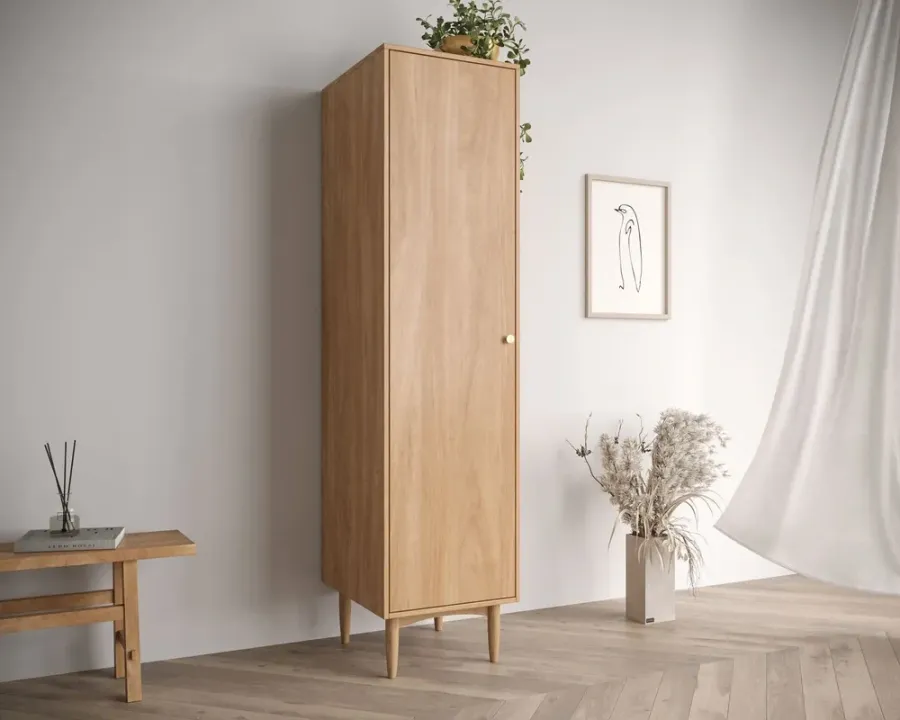 Мебель для Вашего интерьера - шкаф одностворчатый "Bubble solid" в котором качестве материала в изготовлении используется: корпус лдсп, ножки - массив ясеня. Мебель - сделана в стиле скандинавский. Шкаф одностворчатый основное предназначение, которого в домашнем интерьере для белья, для одежды. Шкаф одностворчатый двустворчатый. Мебель выполнена с деревянными ножками.